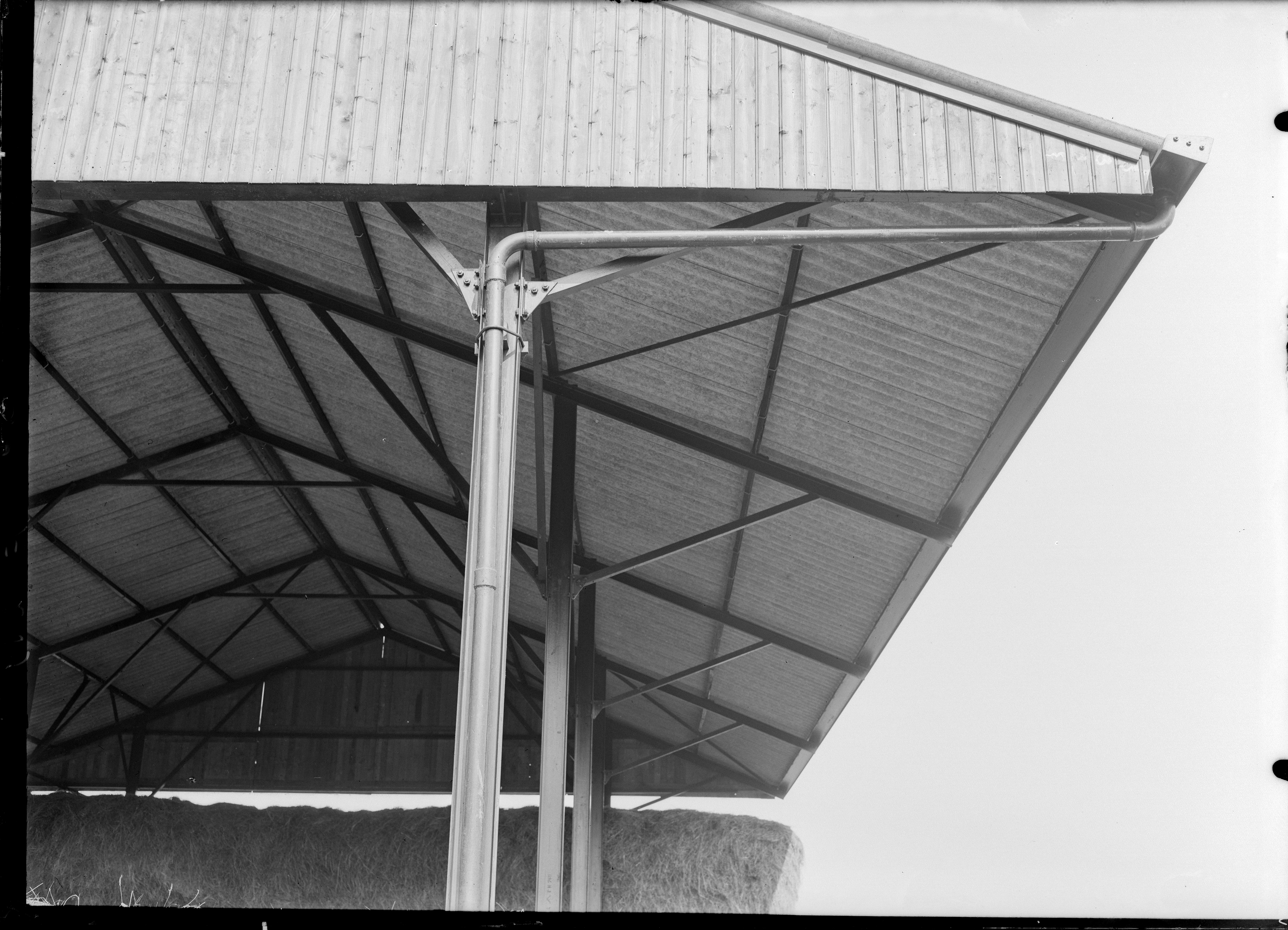 Patentgootconstructie met afvoerpijp van een landbouwhangar.