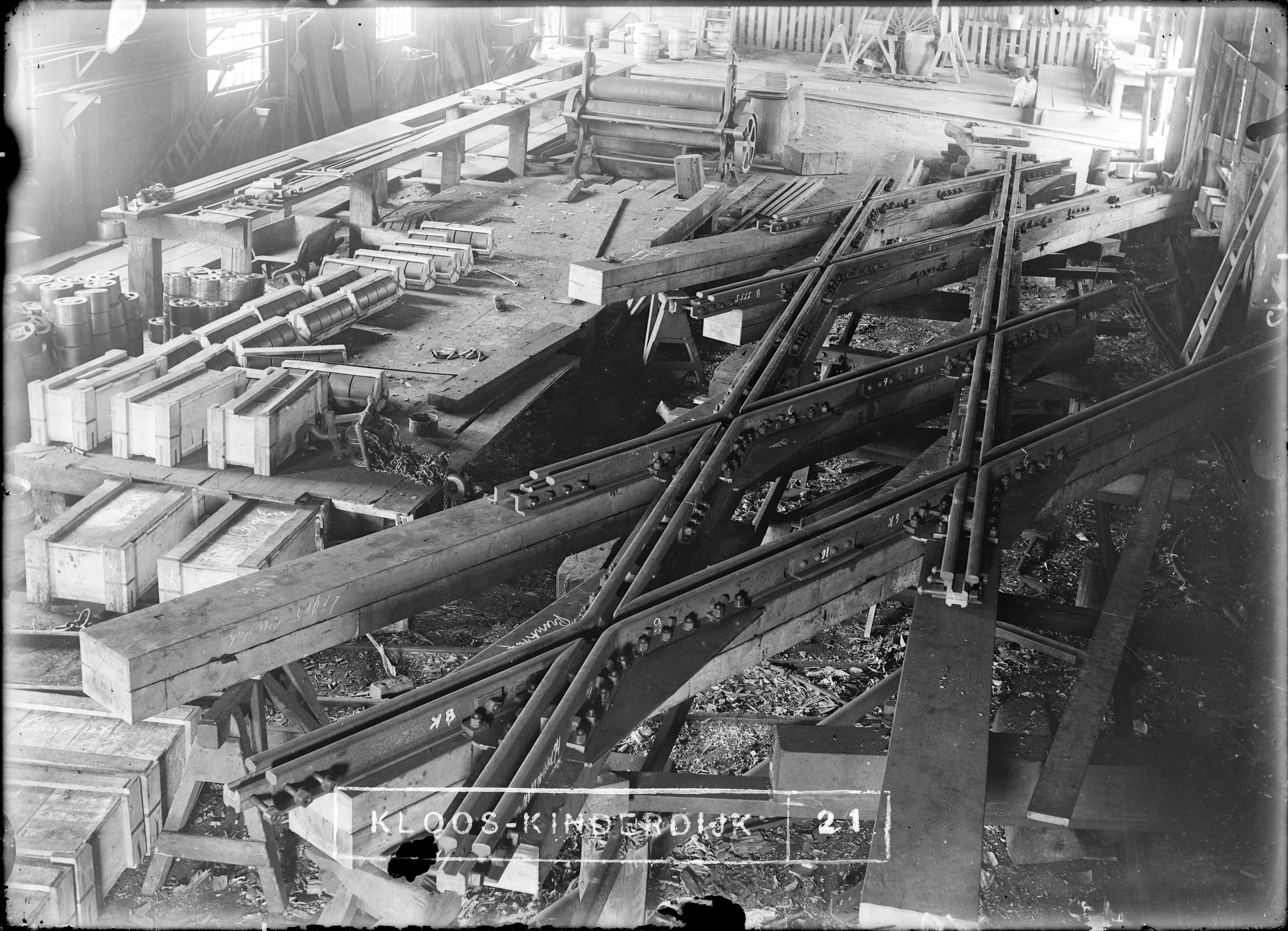 - Drievoudige rechte kruising van tramrails in bestrating op houten onderstel.