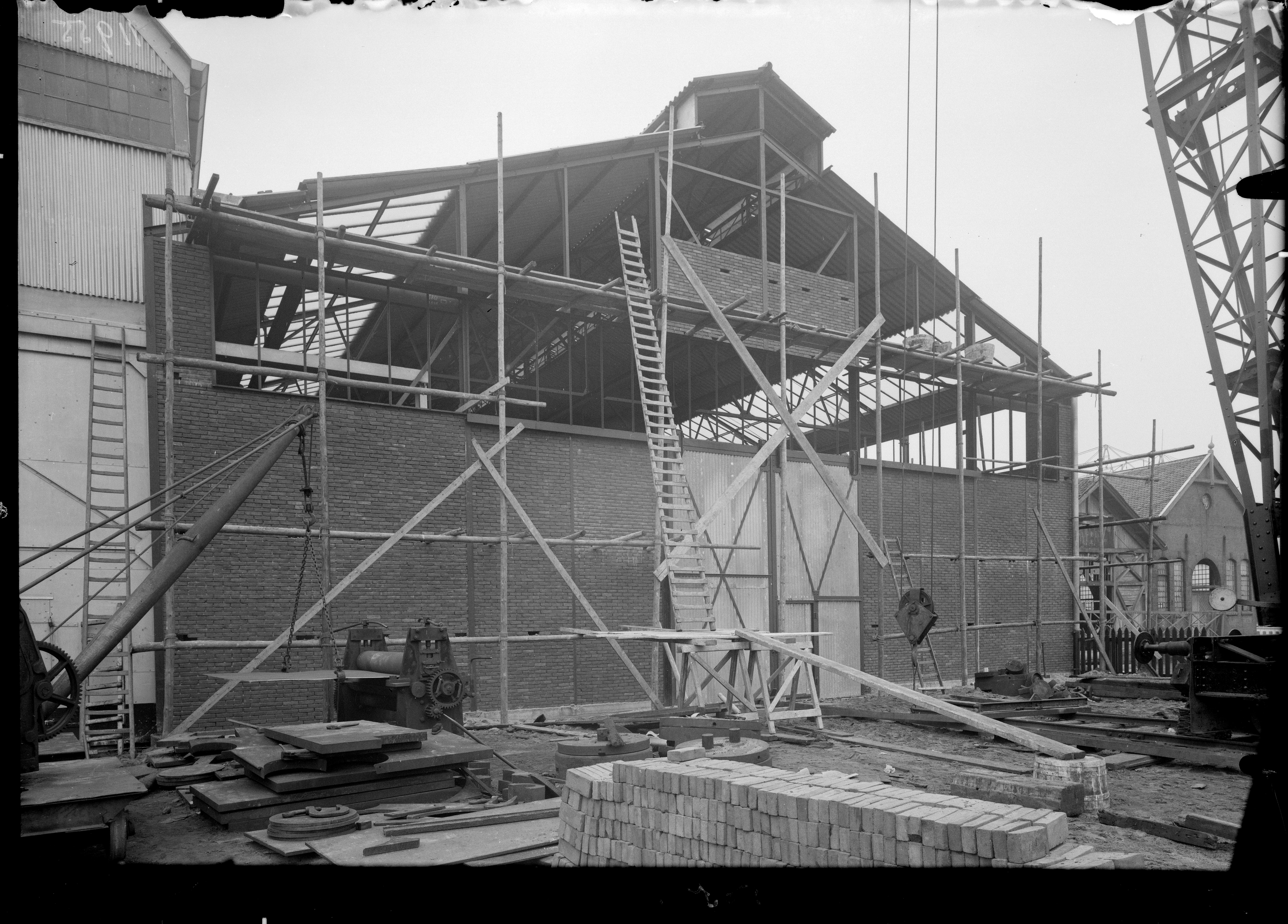 Bouw van ketelmakerij en koperslagerij J. en K. Smit in Kinderdijk.