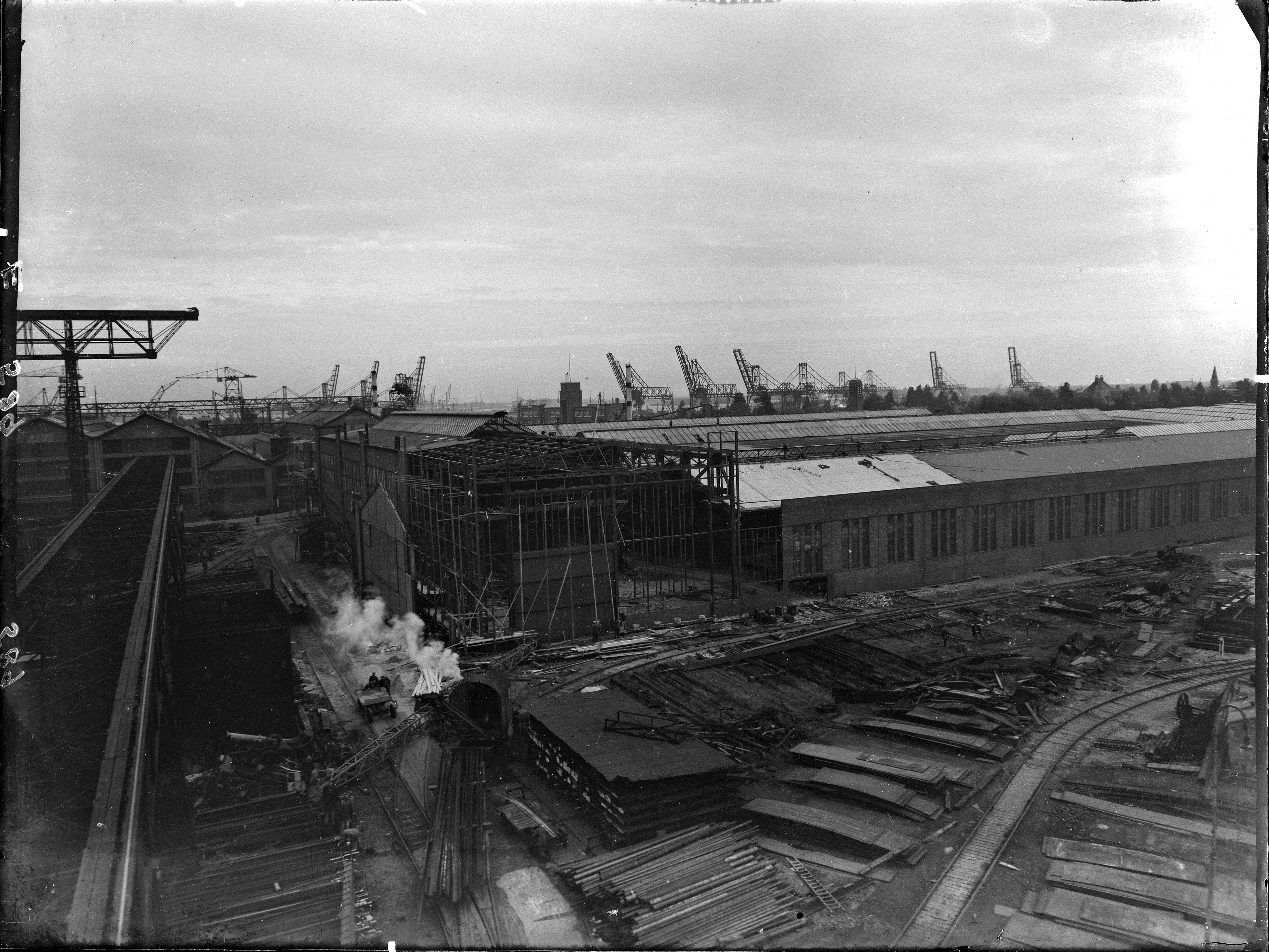 Bouw van een scheepsbouwloods (dwarsbaai) bij de Rotterdamsche Droogdok Maatschappij.