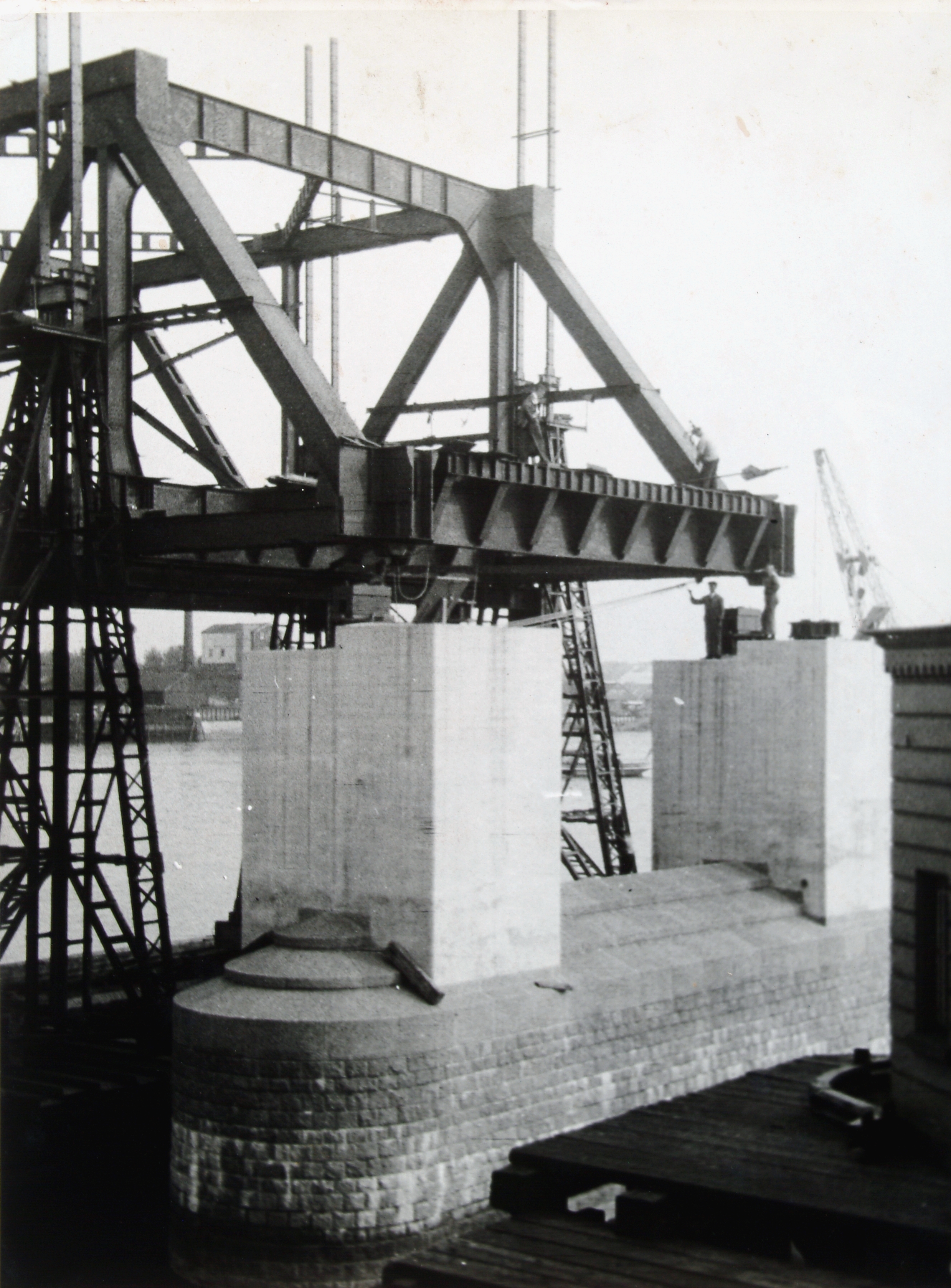 Het eerste brugdeel van de verkeersbrug over de Oude Maas wordt aan de Zwijndrechtse langzaam op de pijlers neergelaten.