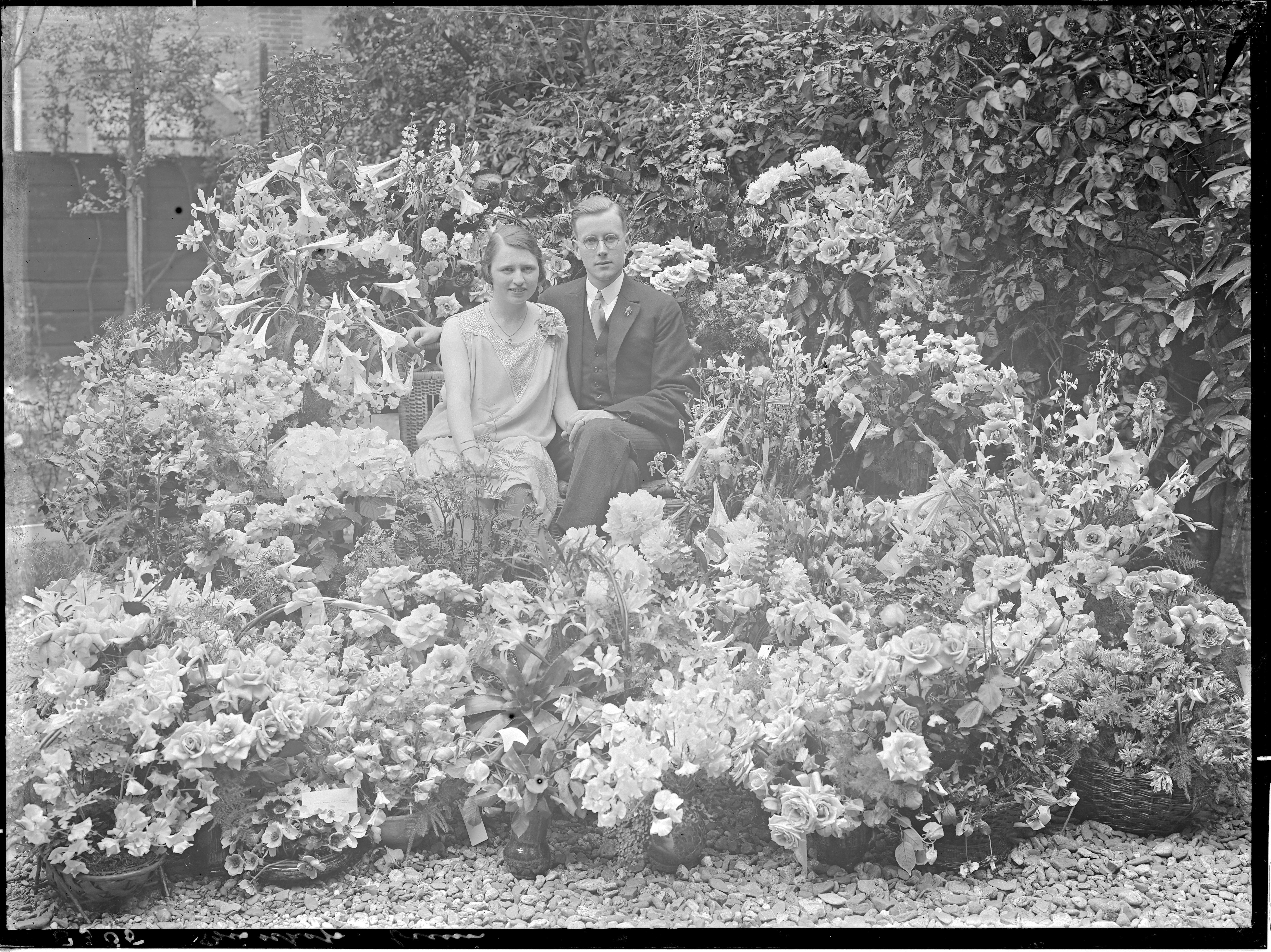 (in de rand '9335 BISSCHOP bruin') jong paar tussen de gekregen bloemen, een zee van bloemen en planten, in de tuin gezeten;