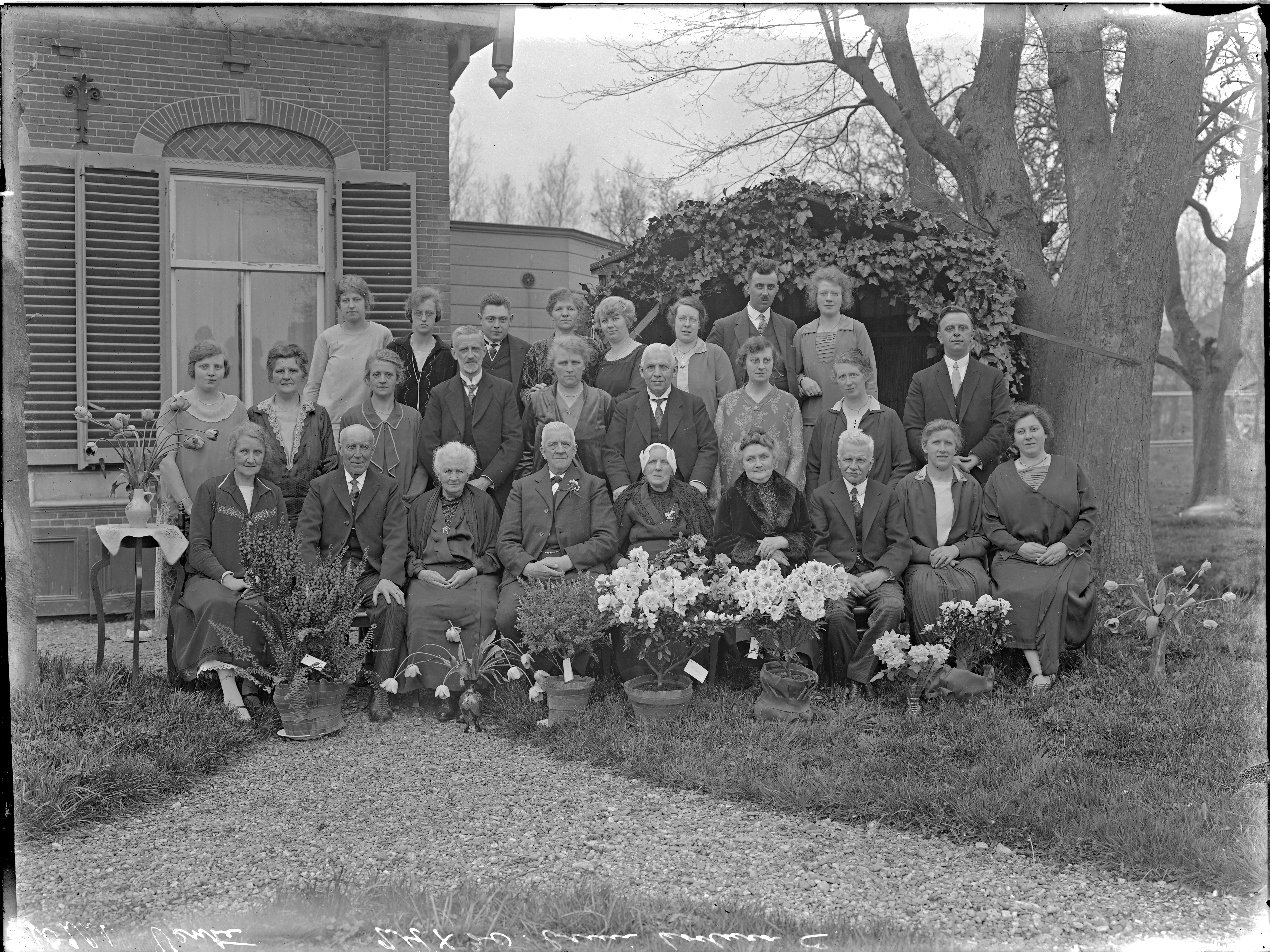 (in de rand '10221 Vente (?) 24x30 bruin kodura E') groepsfoto, in tuin bij woning; 26 personen; (vrouw in klederdracht