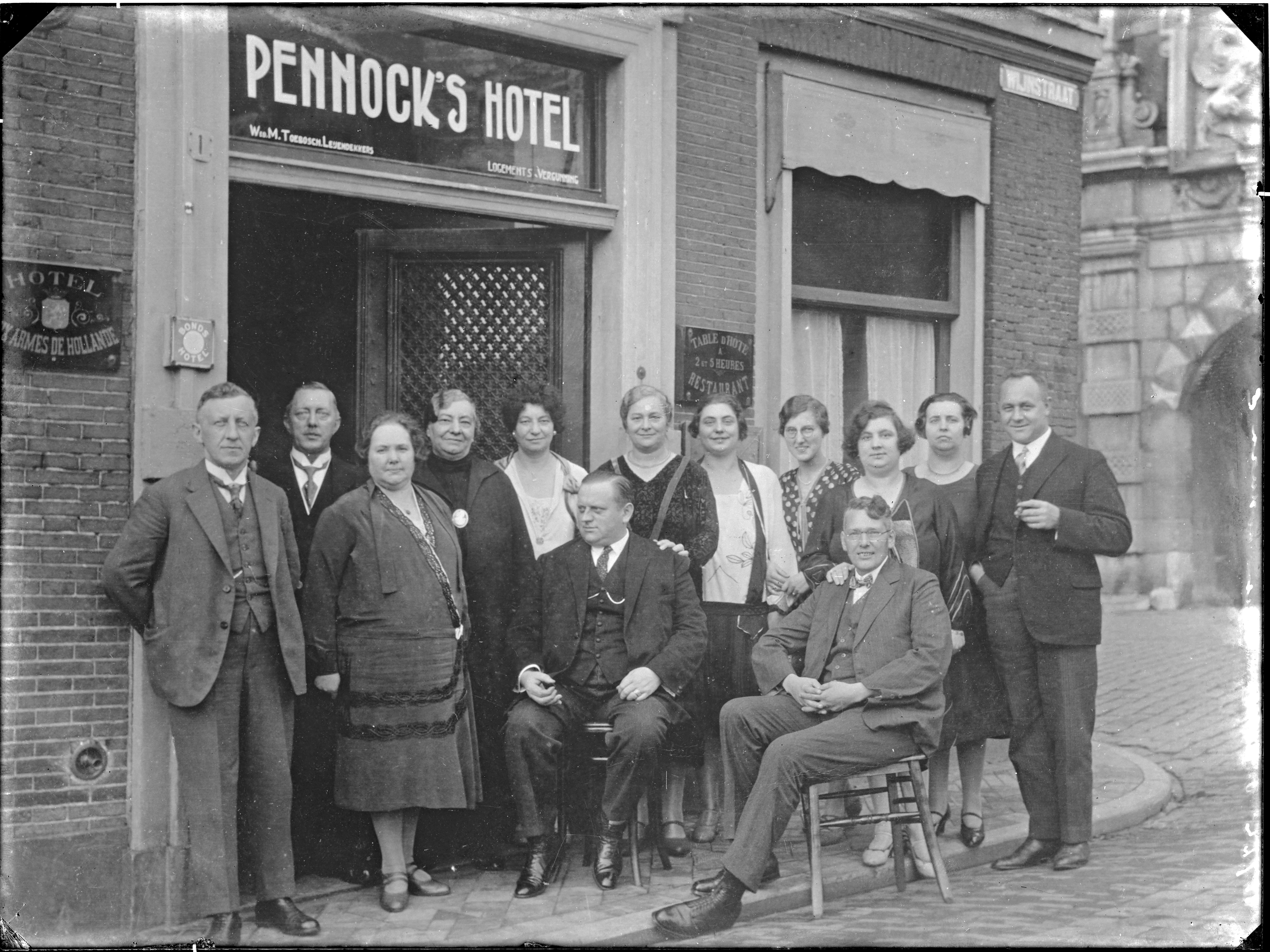 (in de rand '11722') Wed. M.T. Toebosch-Leijdekkers; logementsvergunning; table d'hotel 2 et 5 heures restaurant; 'hotel aux Armes de Hollande'; bondshotel; groepsfoto van 12 personen;
