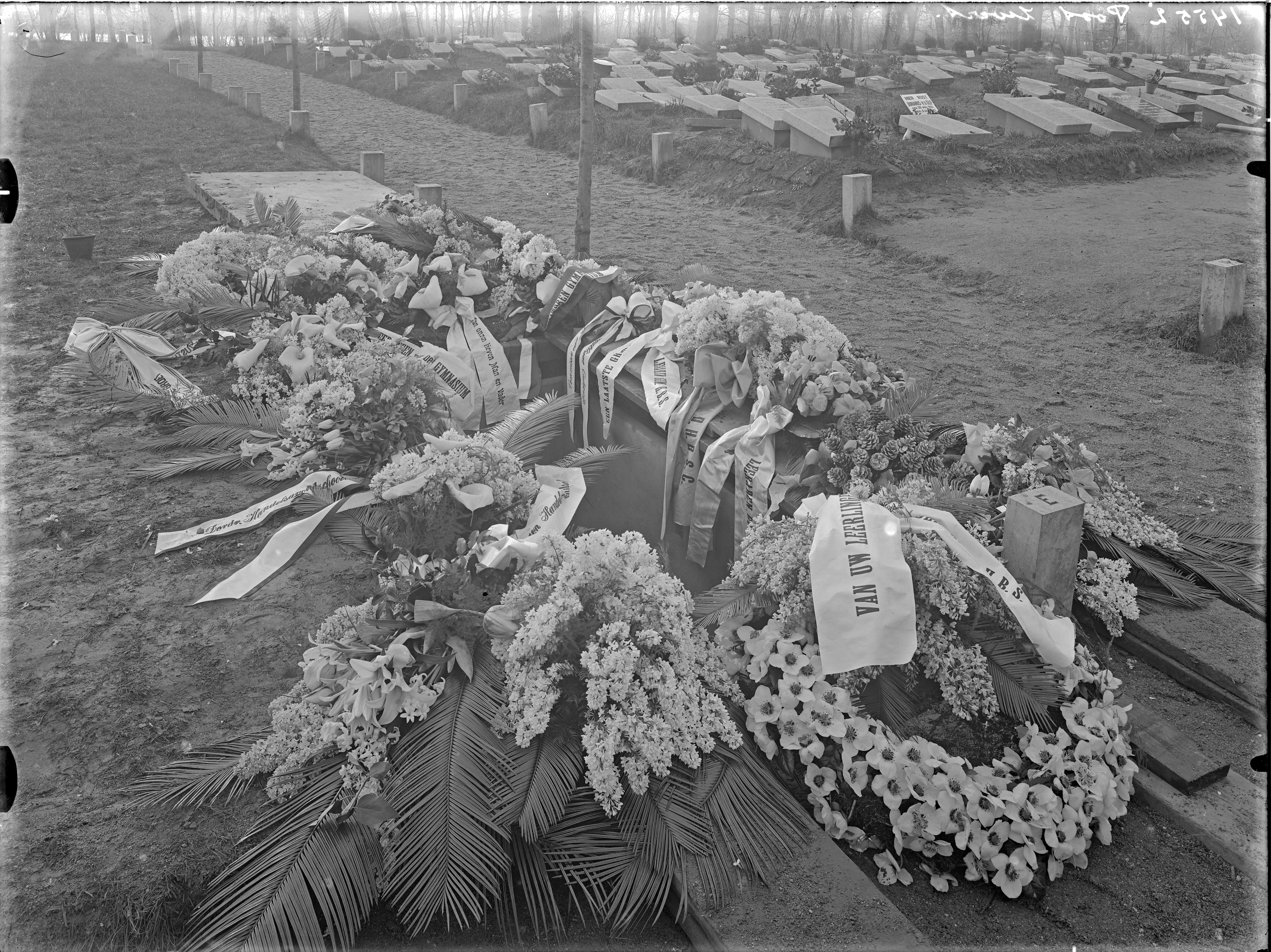 algemene begraafplaats rij E --- open graf met bloemen met linten; (Aan onze lieven man en vader; gymnasium; Dordr. Handelsavondschool; een laatste groet; leraren gem. H.B.S.; van uw leerlingen) (zichtbare zerk op ander veld: hier rust Jurianus v.d. Gijp geb. 25-11-1864, overl. 6 juli 1929)