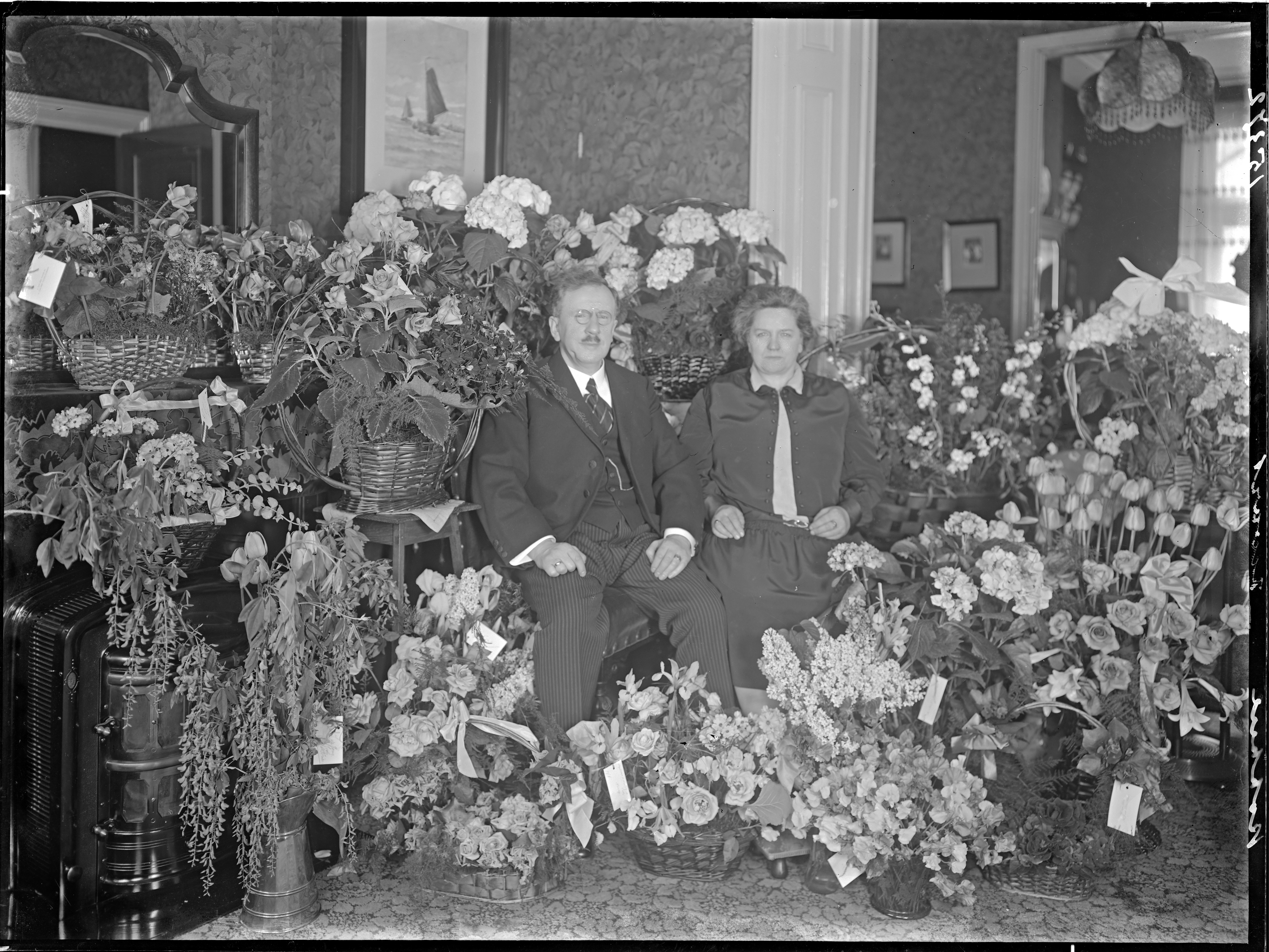 (in de rand '15372 Grobben zwart') echtpaar zittend tussen de bloemen in de huiskamer; ZIE OOK 309_100811