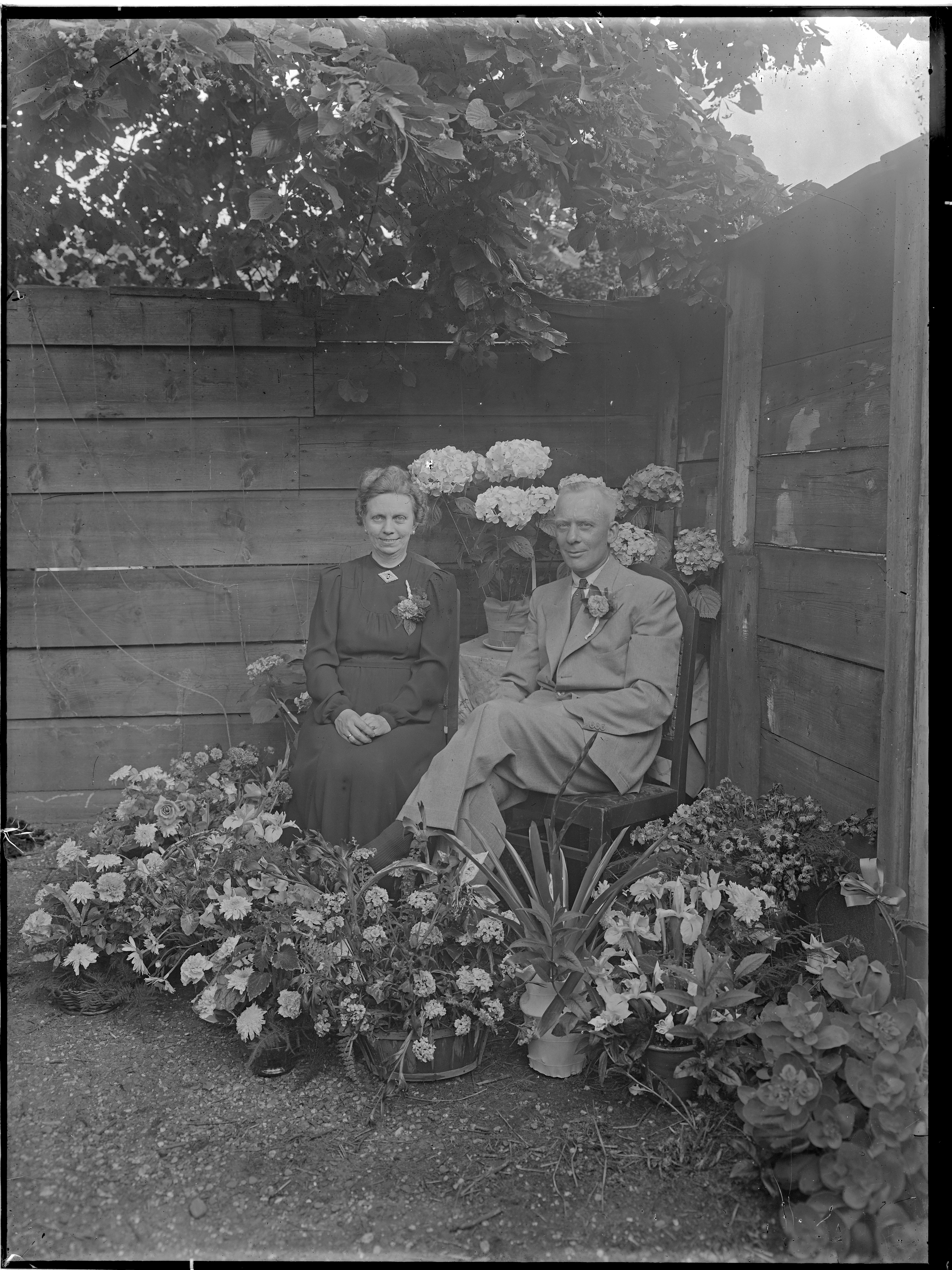 nr. 39375 Allemans -- man vrouw in hoek van de tuin bij schutting