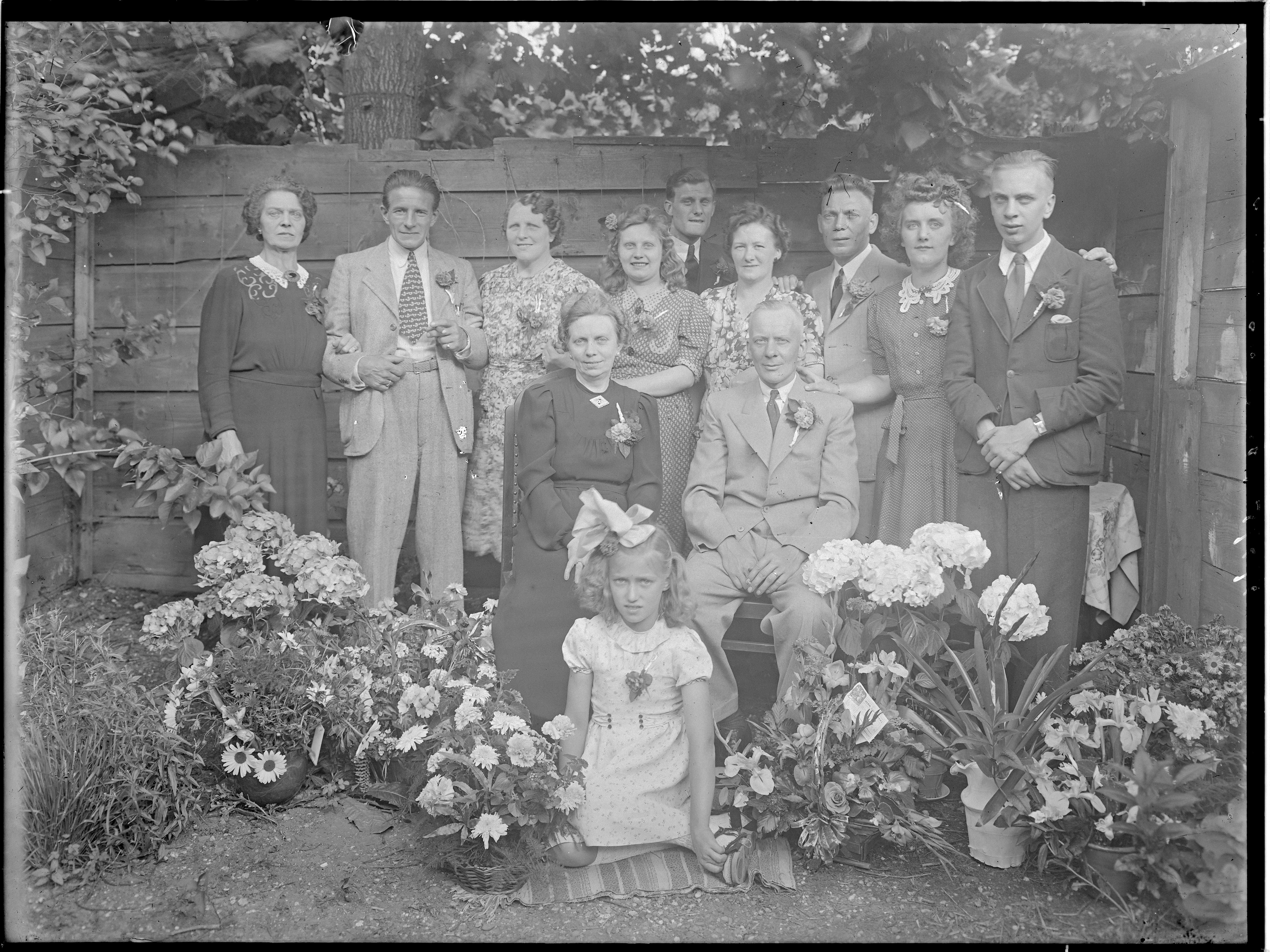 Is de 25-jarige bruiloft van mijn opa (Adrianus/Janus Alleman) en oma (Pieternella/Nel Alleman-Prins). Uiterst links een zus van mijn oma, Rijnburgje/Rijn. Naast de meneer (kan de echtgenoot zijn van tante Rijn?) een andere zus van mijn oma, Catrien.Zij woonden allebei in Den Haag. Achter mijn oma staat Anna, de zus van mijn vader, met haar toenmalige echtgenoot Christiaan Mols (Zat in het verzet en is, na de aanslag op de Duitse commandant Router, met een andere groep verzetsmensen doodgeschoten. Ligt begraven op de erebegraafplaats in Loenen), zij woonden toen ook in Den Haag. Uiterst rechts staat mijn vader, Adrianus/Janus Alleman (1926-2012). Foto inderdaad genomen in de achtertuin van de Vriesepoortshof 23.