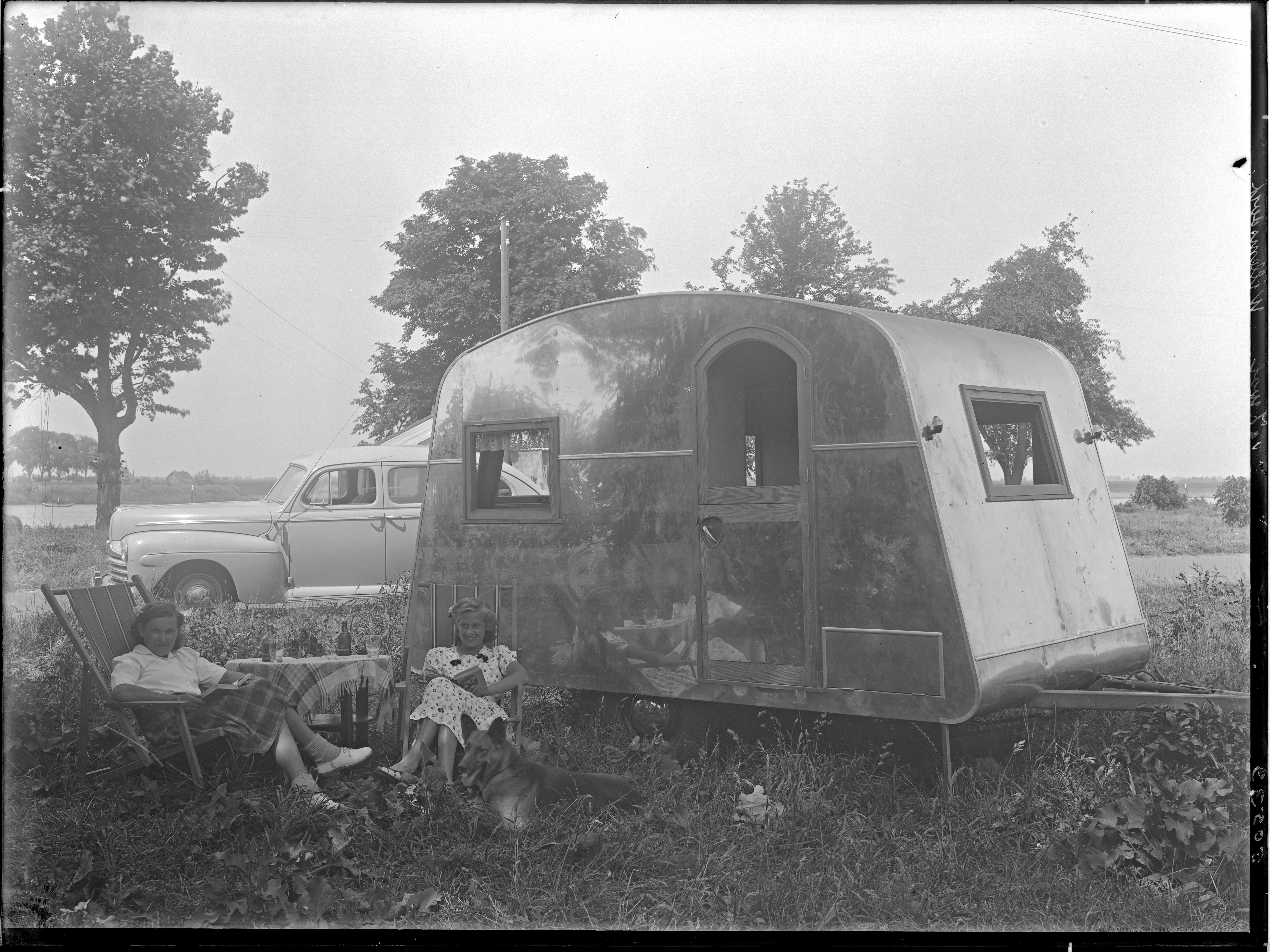 (in de rand 'nr. 50533 v.d. ZWOL Willemsdorp') dames zittend bij caravan (in de berm) ---- (hoort bij 309_102120)