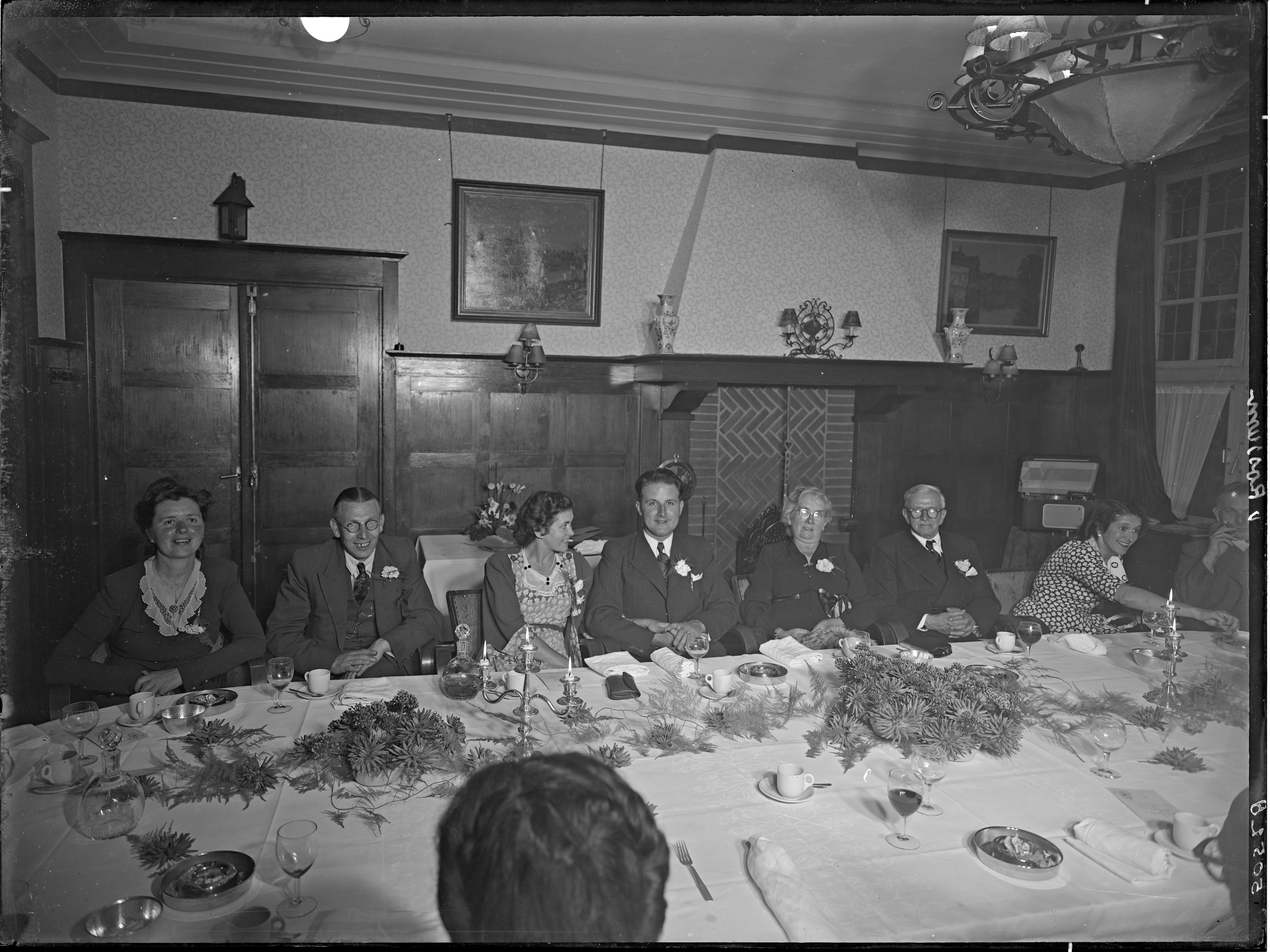 groepsfoto: diner, restaurant, gedekte tafels ----- BEERMAN 31-12-1949 fotonummer 50528 van Rossum, Papendrecht [bron: www.dordtenaZOEKer.nl]