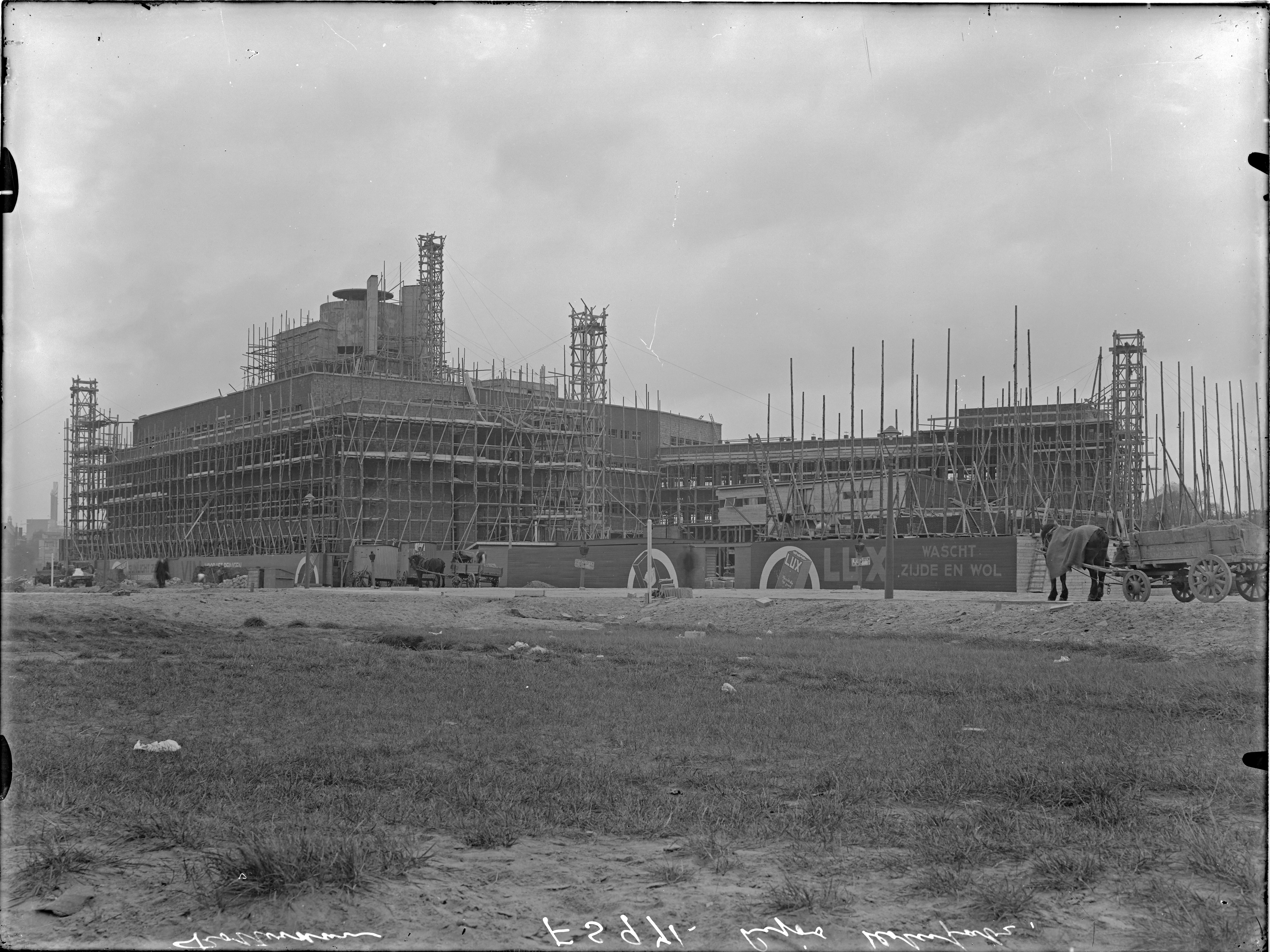 (in de rand 'Lips Slotenfabriek') fabriek in aanbouw (reclame op schutting: LUX wascht zijde en wol)