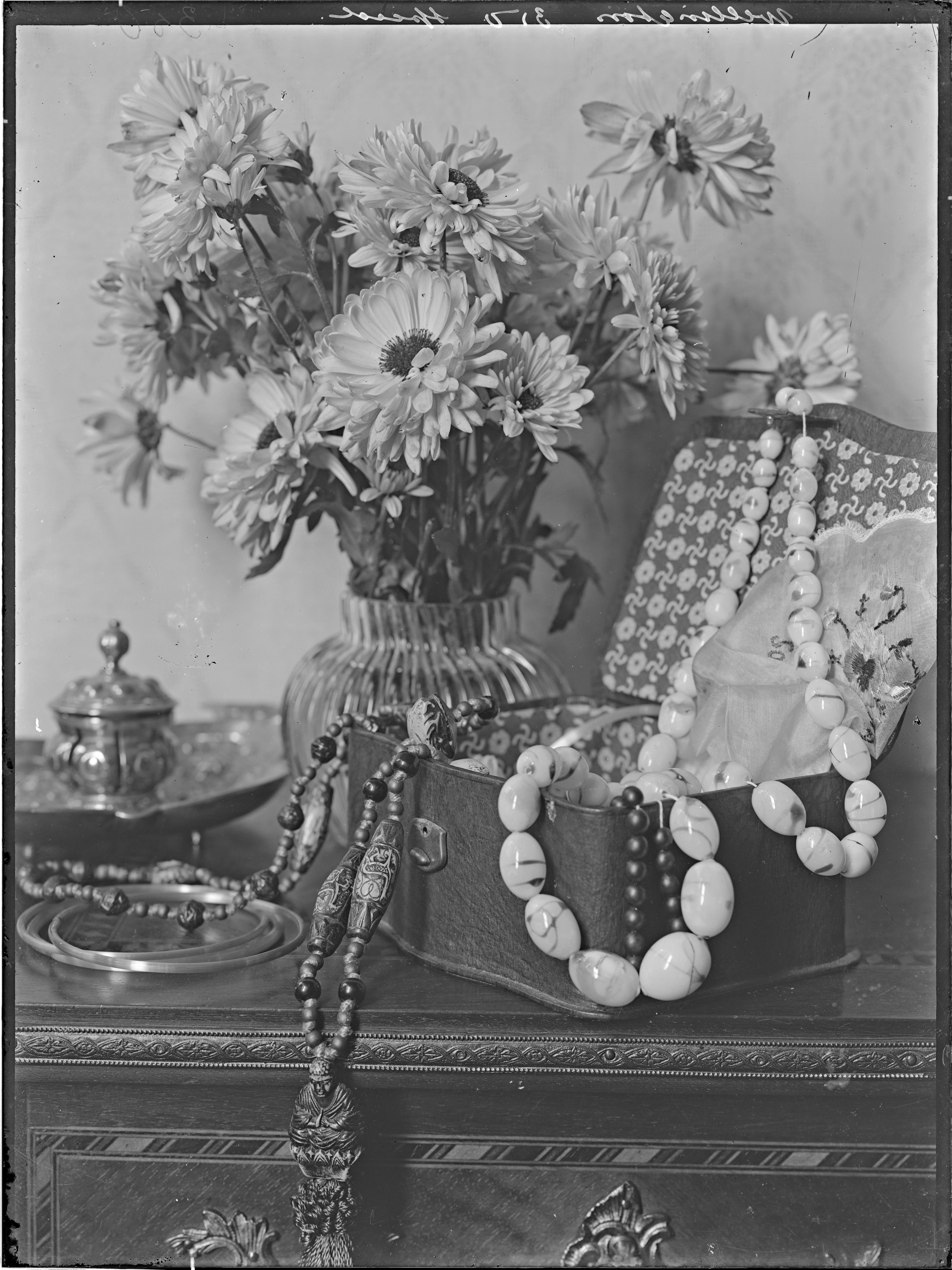 (in de rand: Wellington 350 speed) ------ sieradenkistje, vaas met bloemen, kettingen