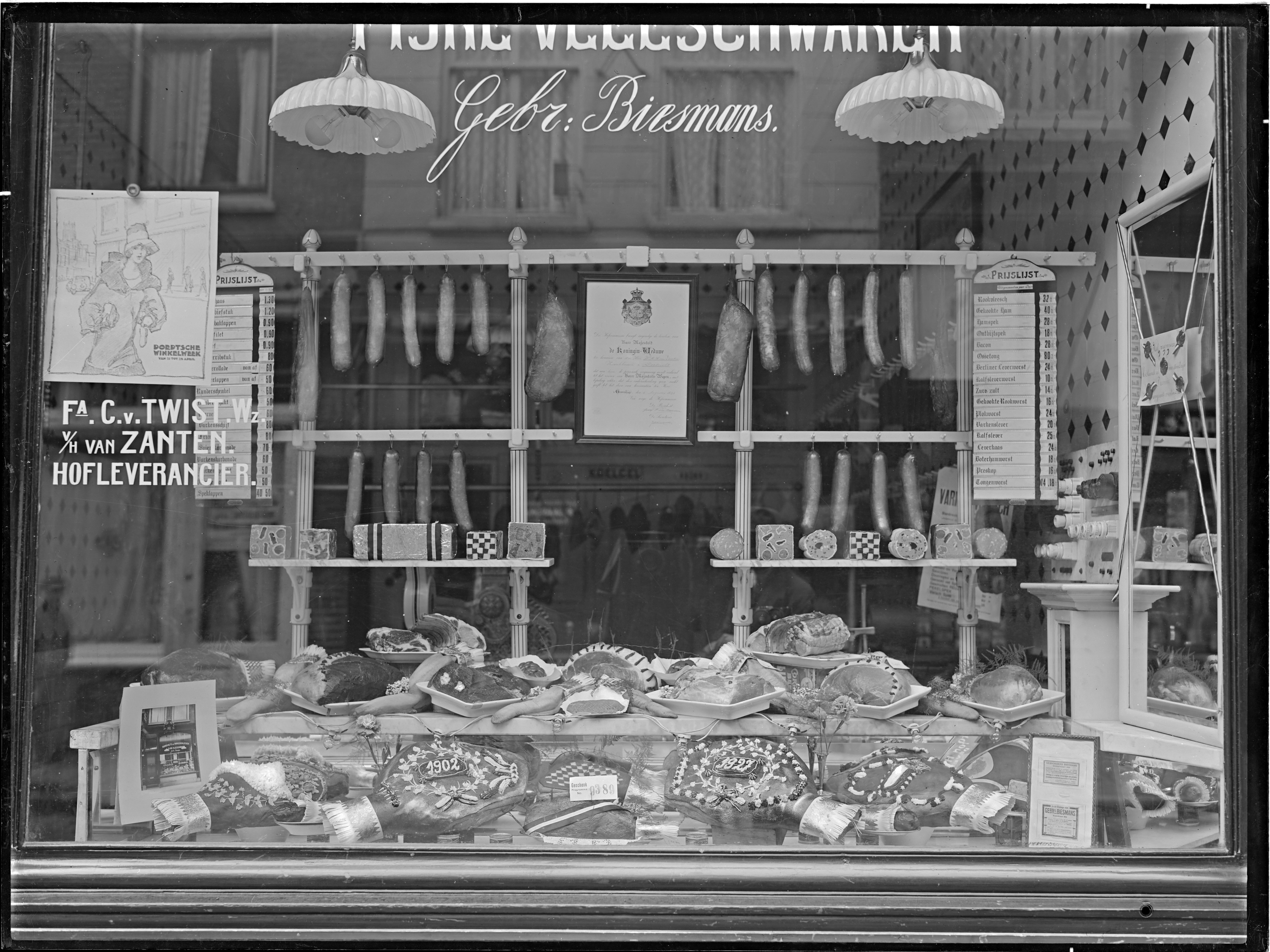ETALAGE (Dordtsche winkelweek) - Fa. C. van Twist wzn v/h van Zanten, hofleverancier / Fijne vleeschwaren Gebr. BIESMANS; ---- (adresboek 1930: L.H.Th. Biesmans, Voorstraat 364; Ludovicus Hubertus Theodorus Biesmans, Voorstraat 364 (kadaster E 672))