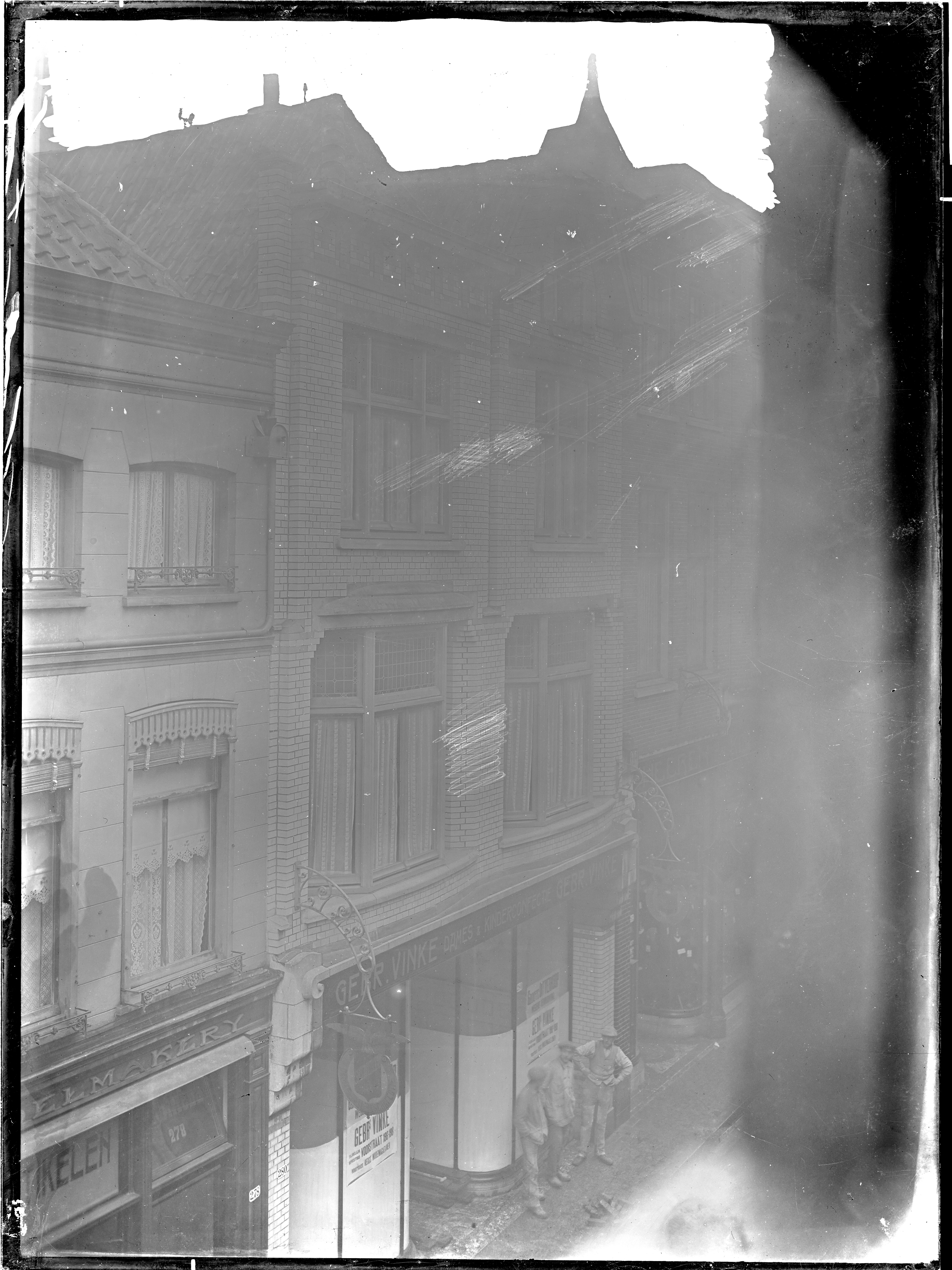 foto vanuit raam, met zicht op de winkel van Gebr. VINKE, Voorstraat 280, naast Voorstraat 278 (dames en kinderconfectie); Vinke zit tijdelijk op Voorstraat 196-198 (voorheen Keuss' Modemagazijnen);