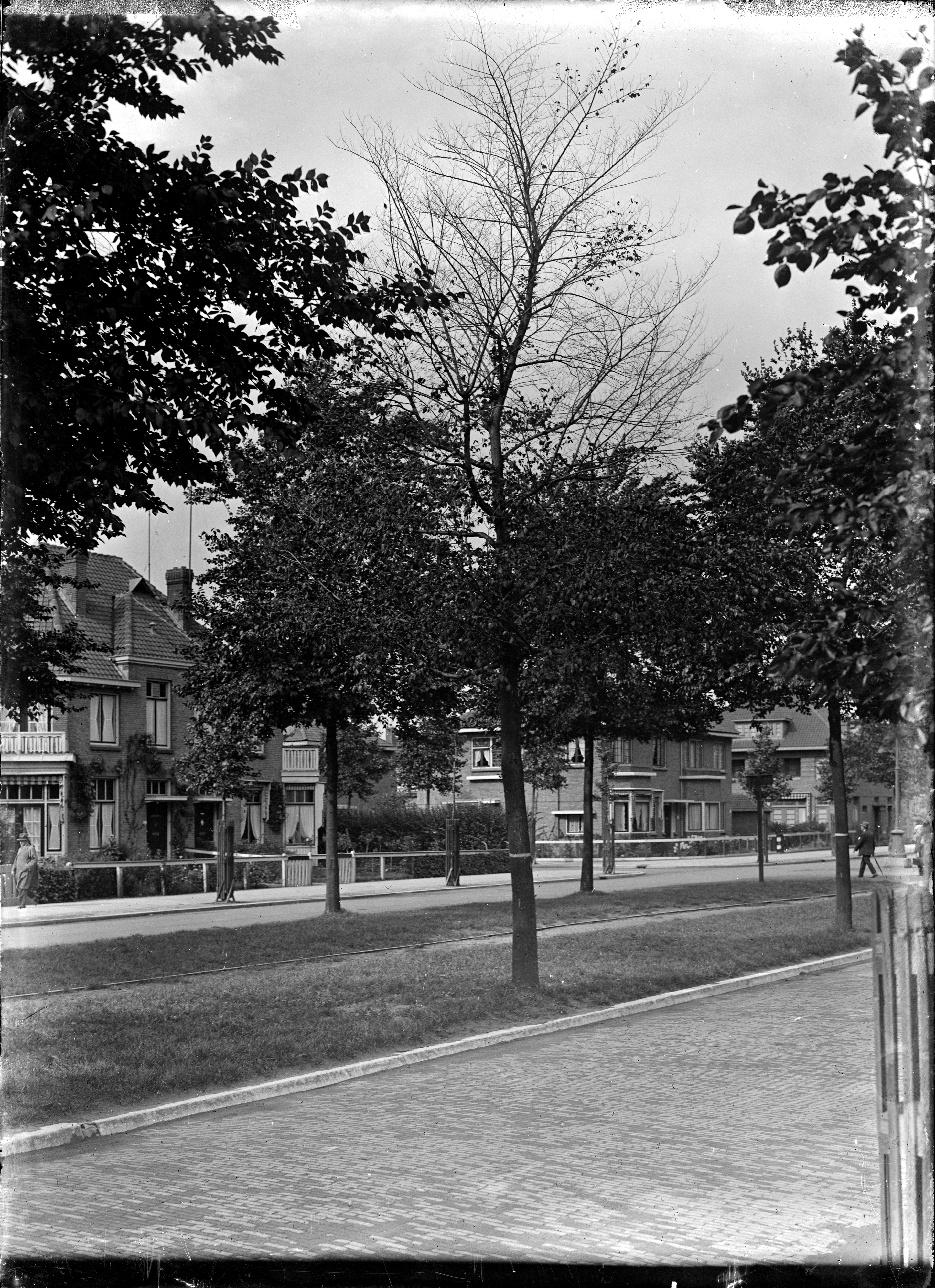 De Oranjelaan ter hoogte van de Gevaertsweg (links midden). In de middenberm lopen de …