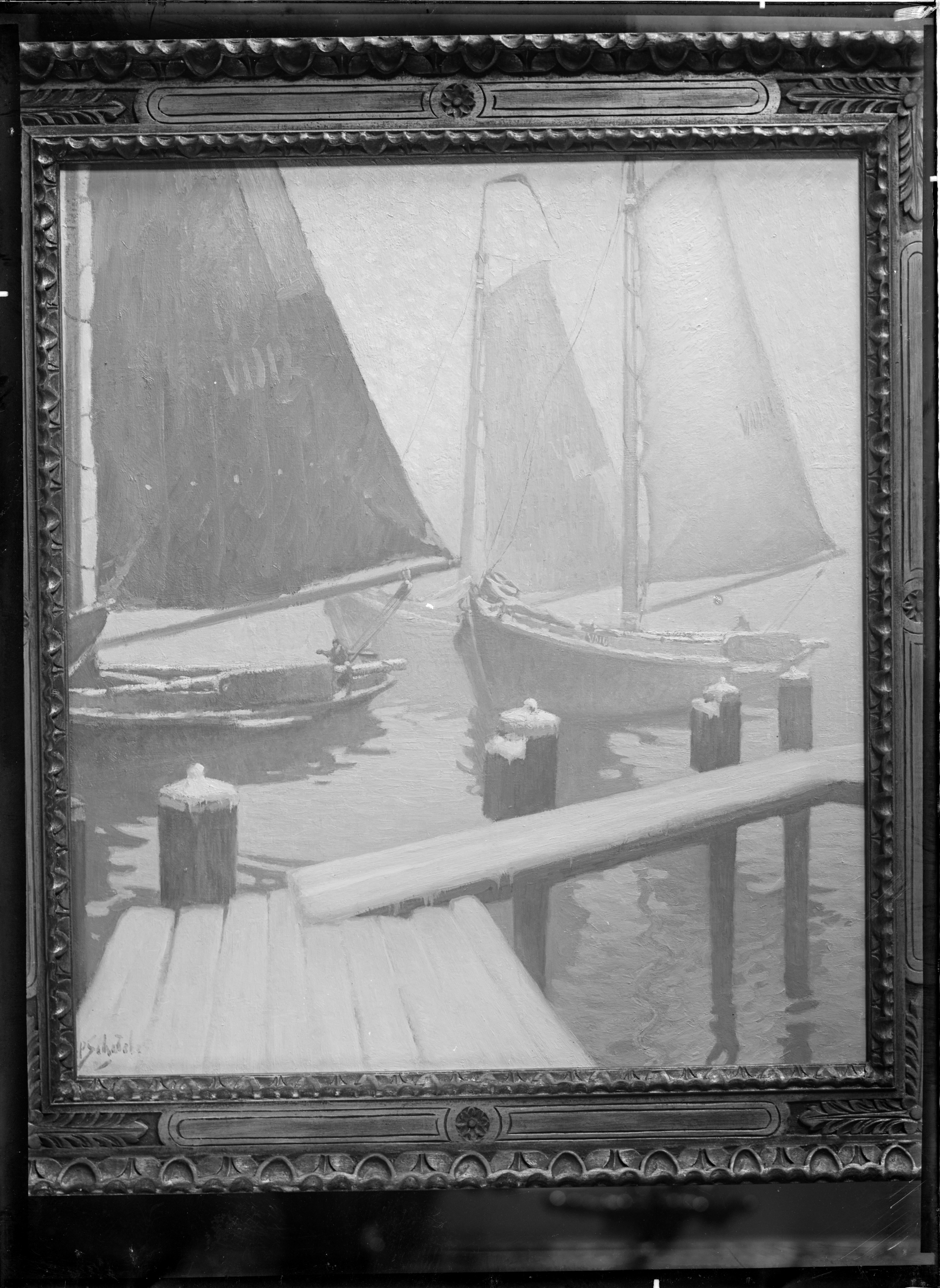schilderij (vissersschepen Volendam VD12) Anthonie Pieter Schotel (1809-1958)