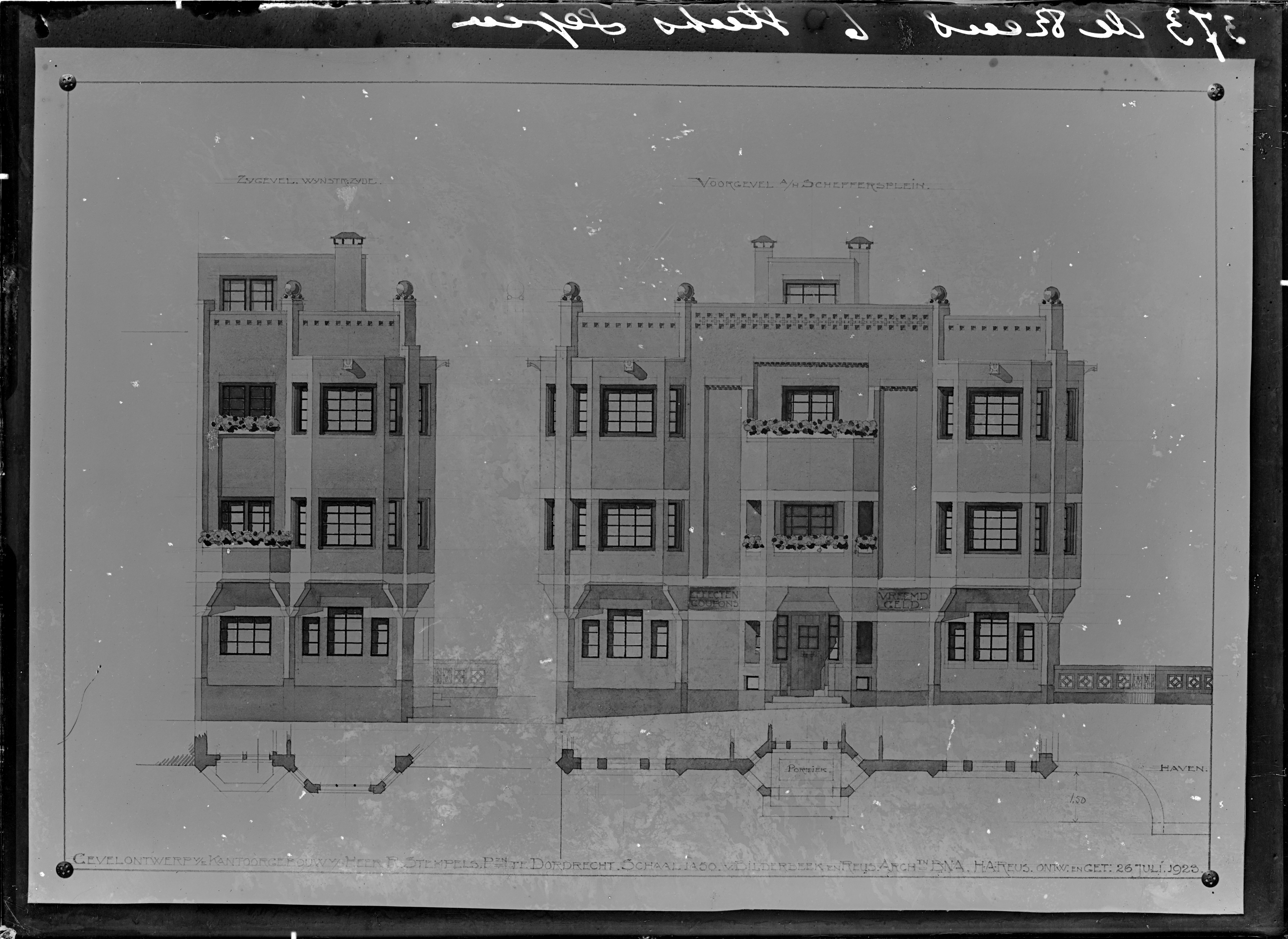 gevelontwerp van een kantoorgebouw v.d heer R. [Roelof] STEMPELS Pzn te Dordrecht (Bilderbeek en Reus, architecten; H.A. Reus, ontwerp), 26 juli 1923; (voorgevel Scheffersplein, zijgevel Wijnstraat)