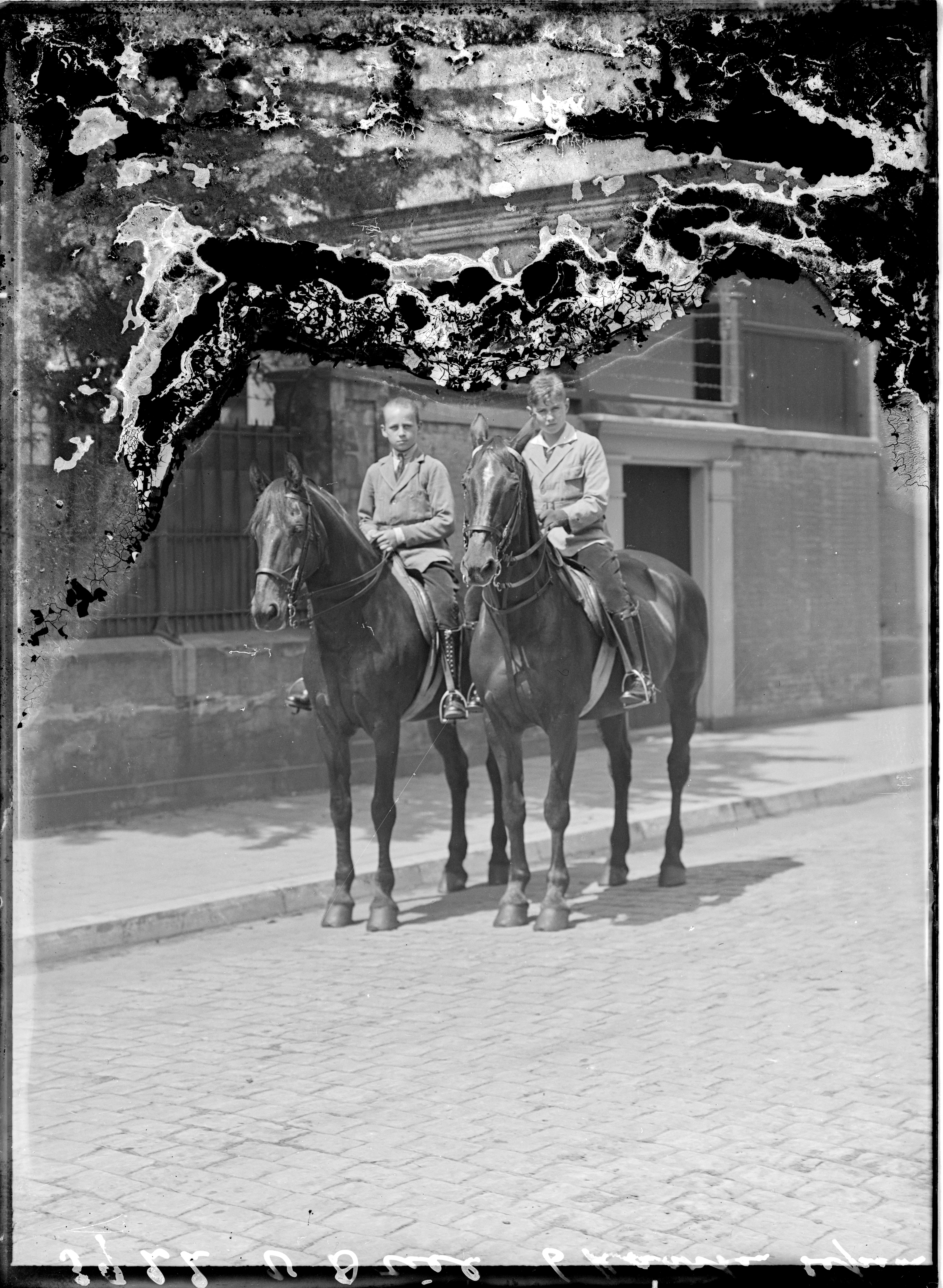 (zie 309_105673) te paard, twee jongens op paard (ijzeren hek) ---- BEERMAN 04-07-1925 fotonummer 3922 Mw. van Driel Joh. de Wittbrug [www.dordtenazoeker.nl]