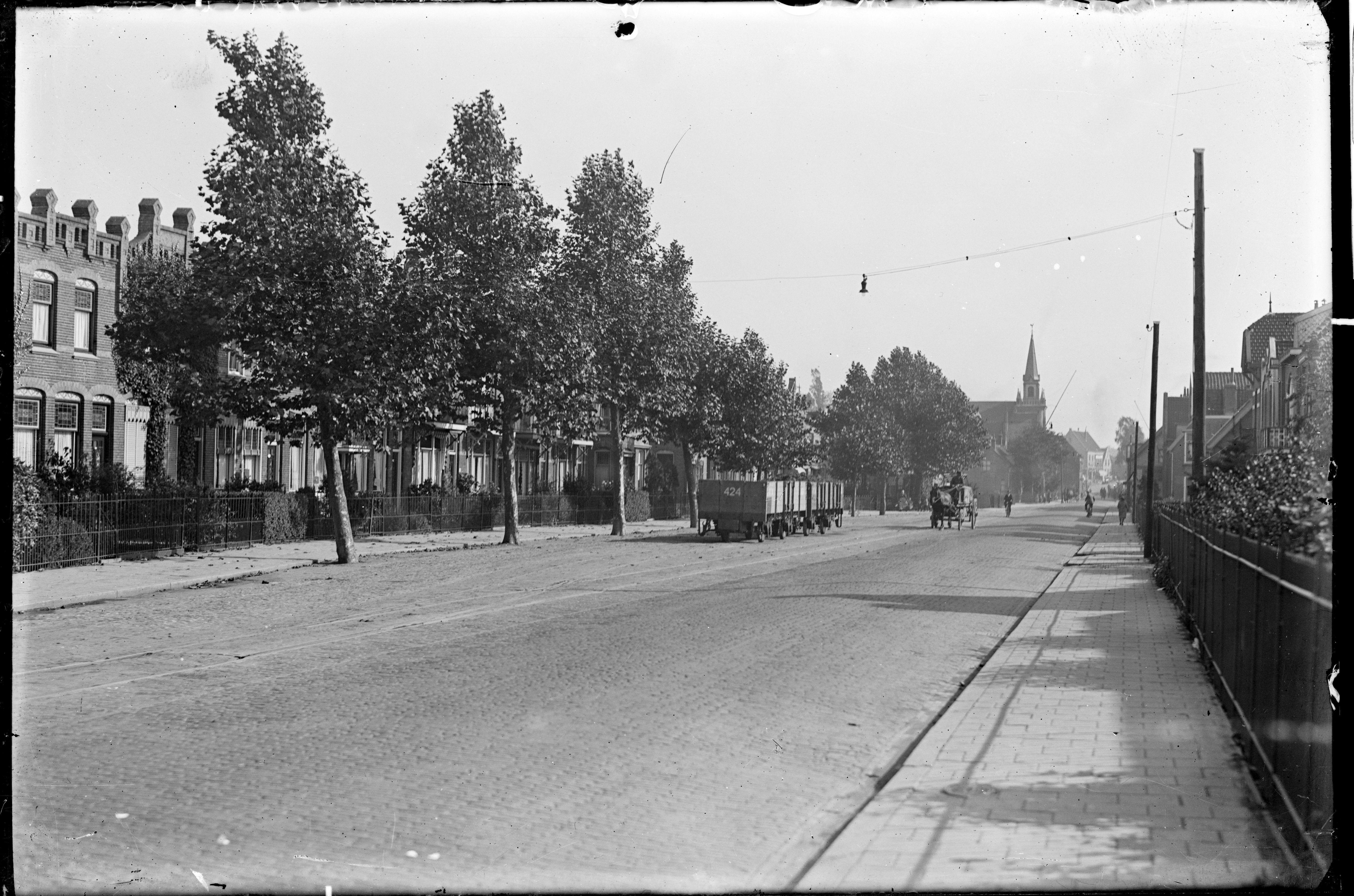 - De Rotterdamseweg in Zwijndrecht naar het zuidoosten. De Bethelkerk op de achtergrond. Over de weg lopen spoorrails.
