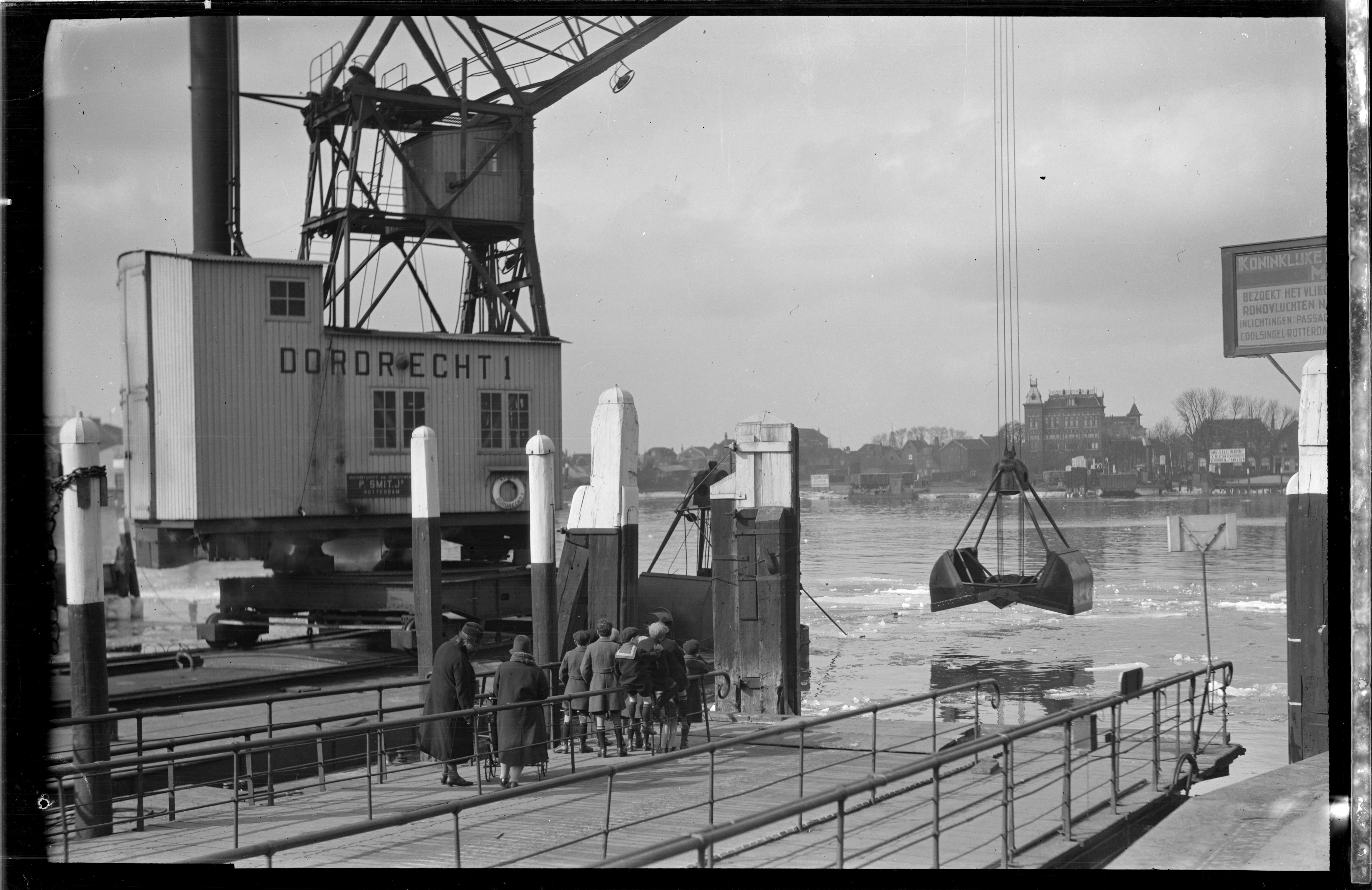 - Een kraan baggert in de Oude Maas bij het Zwijndrechts veer.