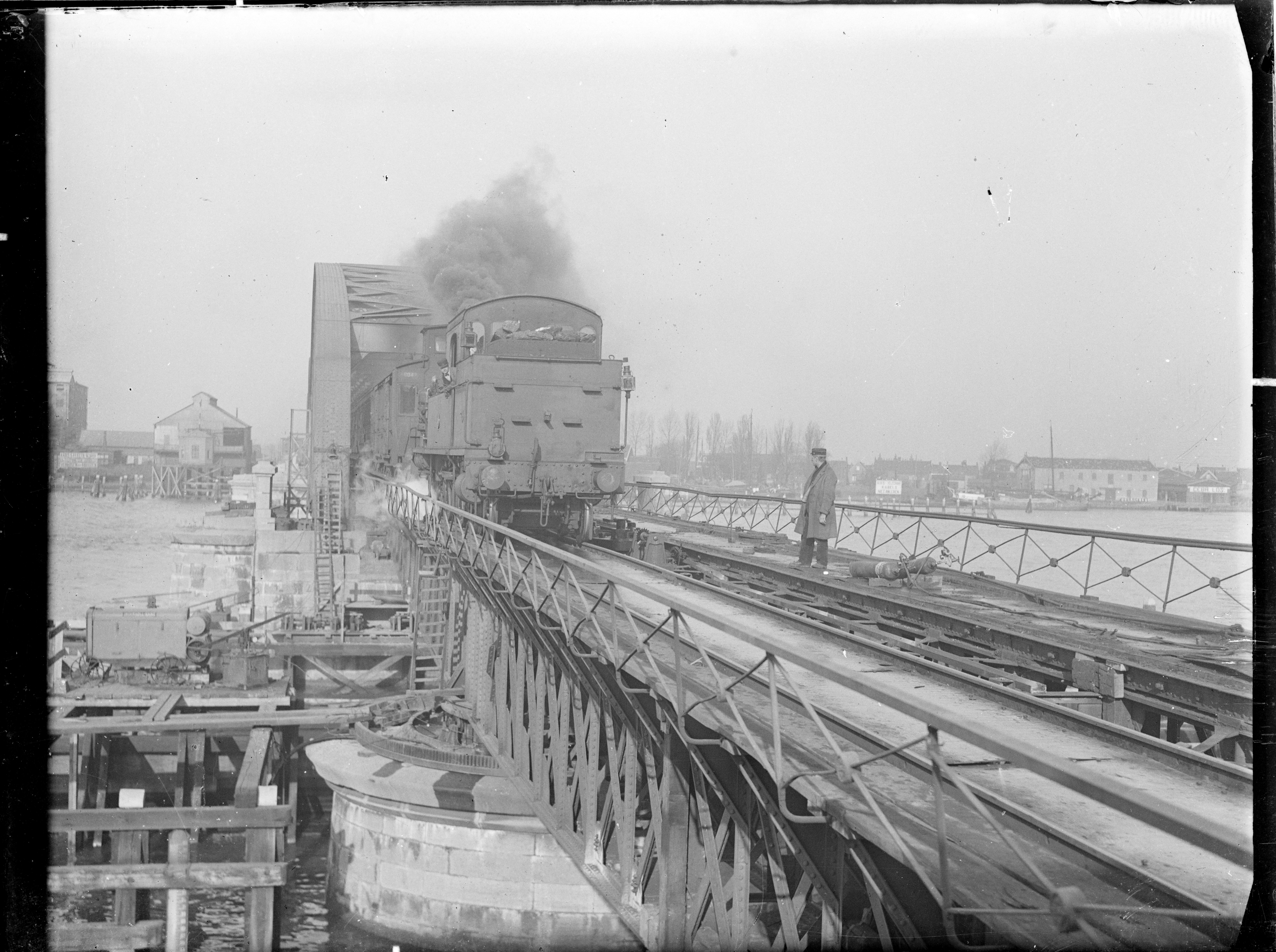 - Werkzaamheden aan de spoorbrug over de Oude Maas, gezien richting Zwijndrecht. Links Chemproha.