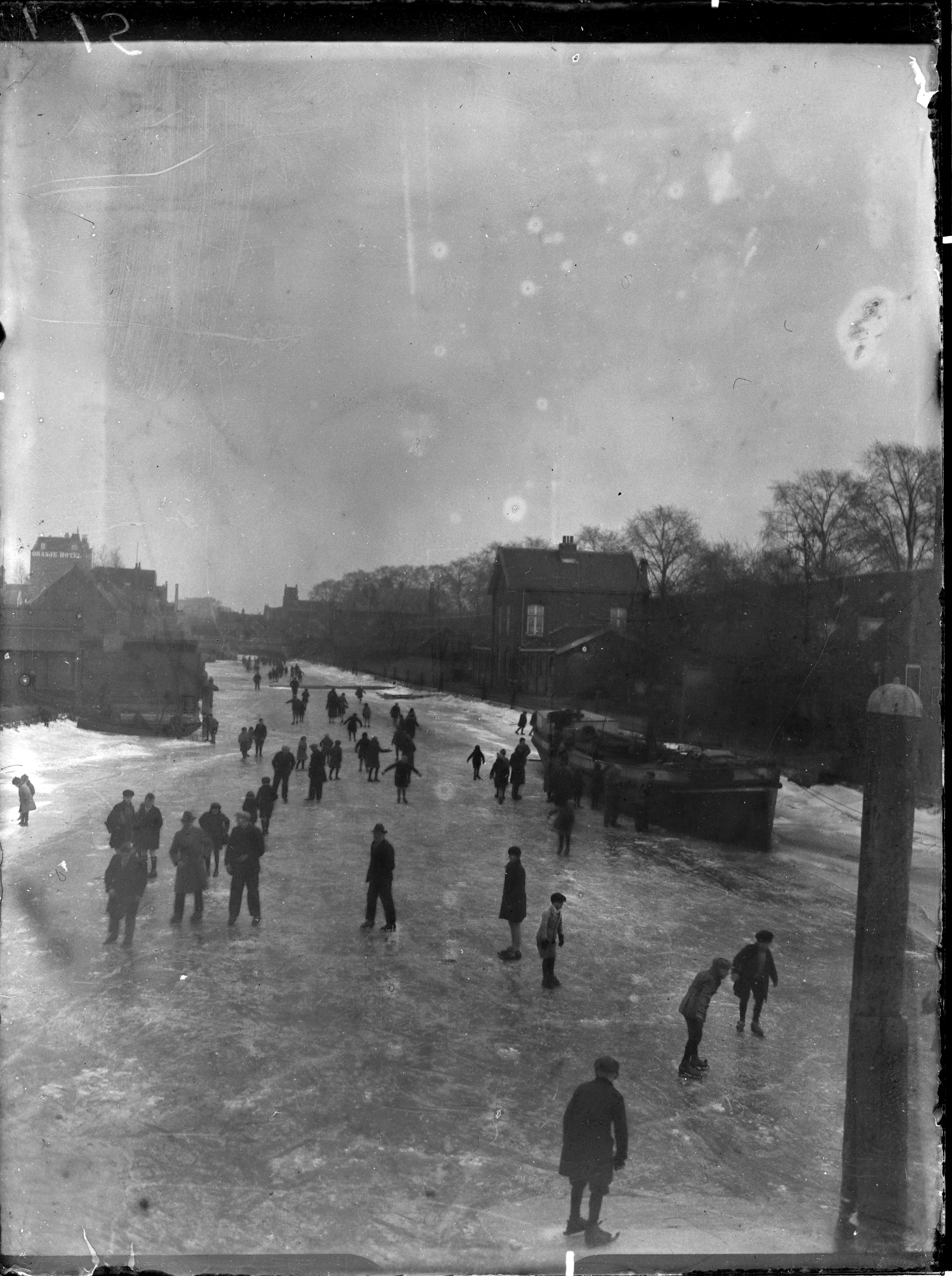 - Schaatsers op de dichtgevroren Spuihaven, gezien vanaf de Spuibrug naar de Johan de Wittbrug. Links de Vest, rechts de 's Landswerf aan de Cornelis de Wittstraat.