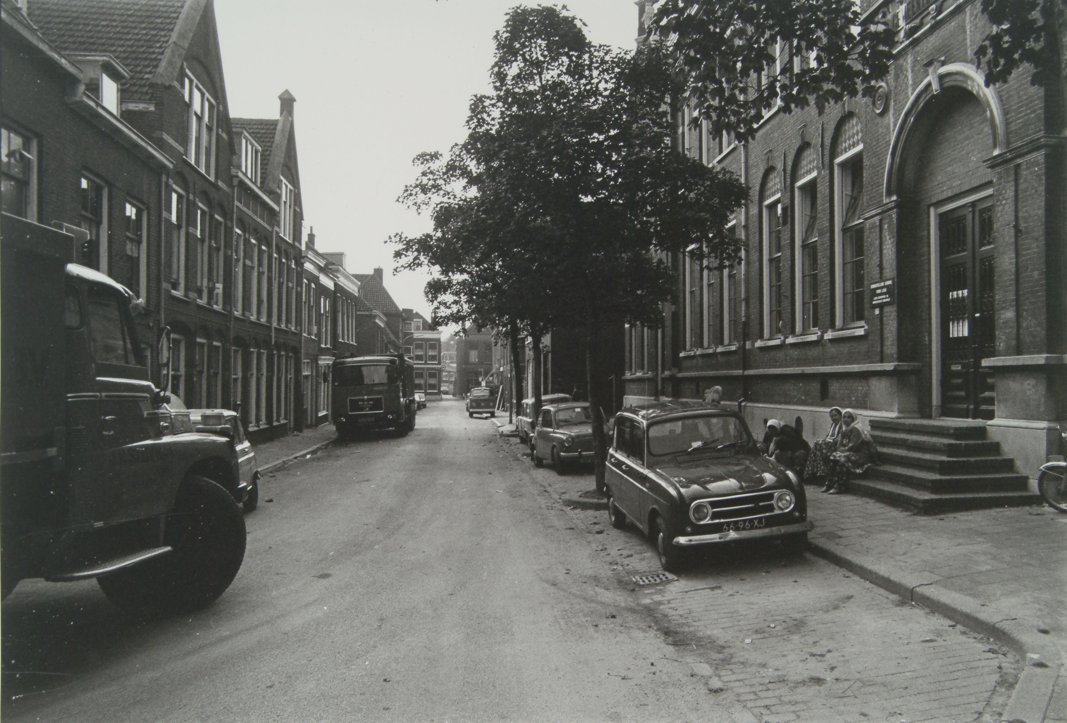 Rechts een schoolgebouw bijna hoek Warmoezierspad