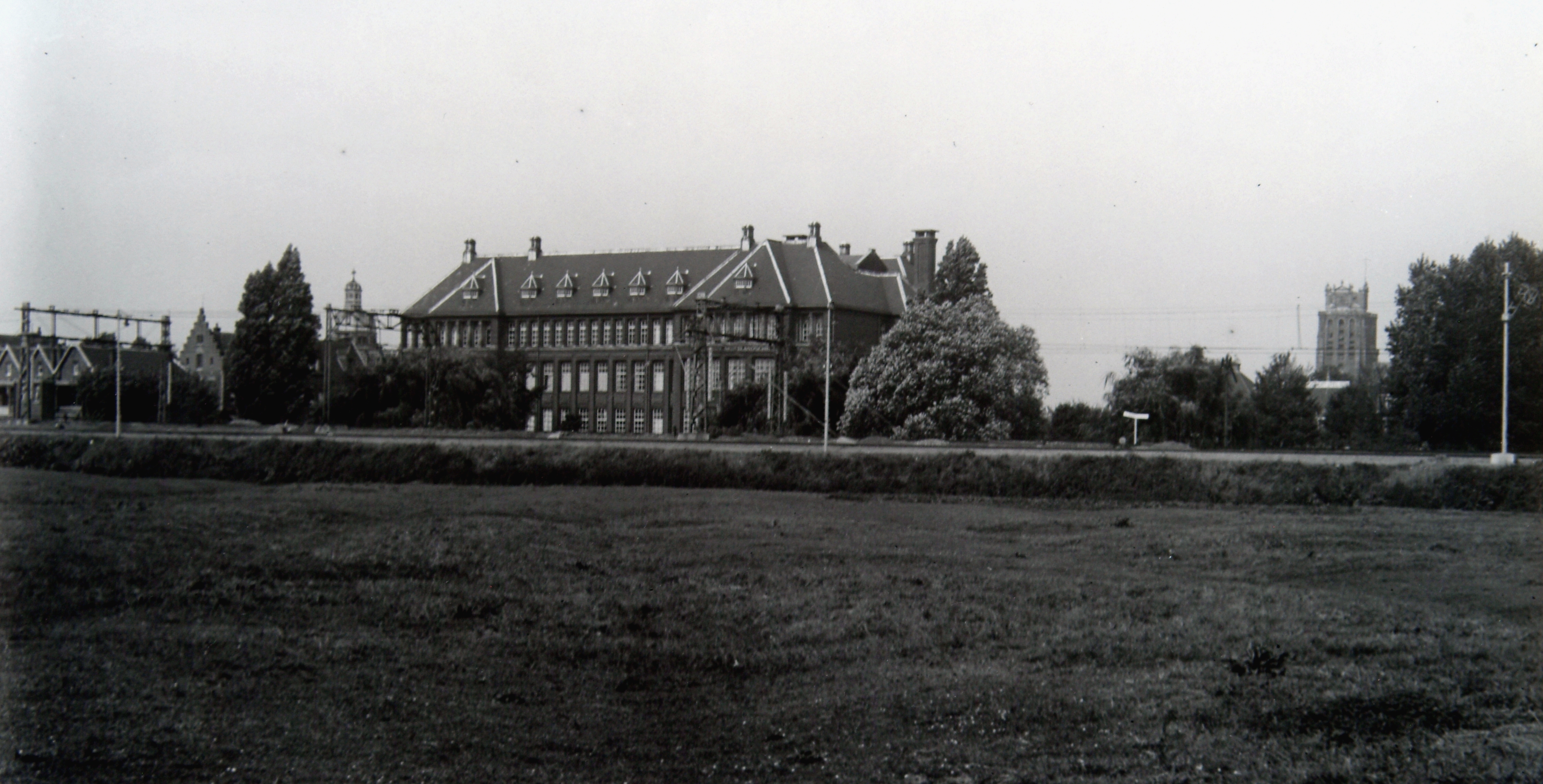 - Gezicht vanuit de Watemolenweide op het gebouw van verzekeringsmaatschappij Eerste Nederlandsche aan de Havenstraat.