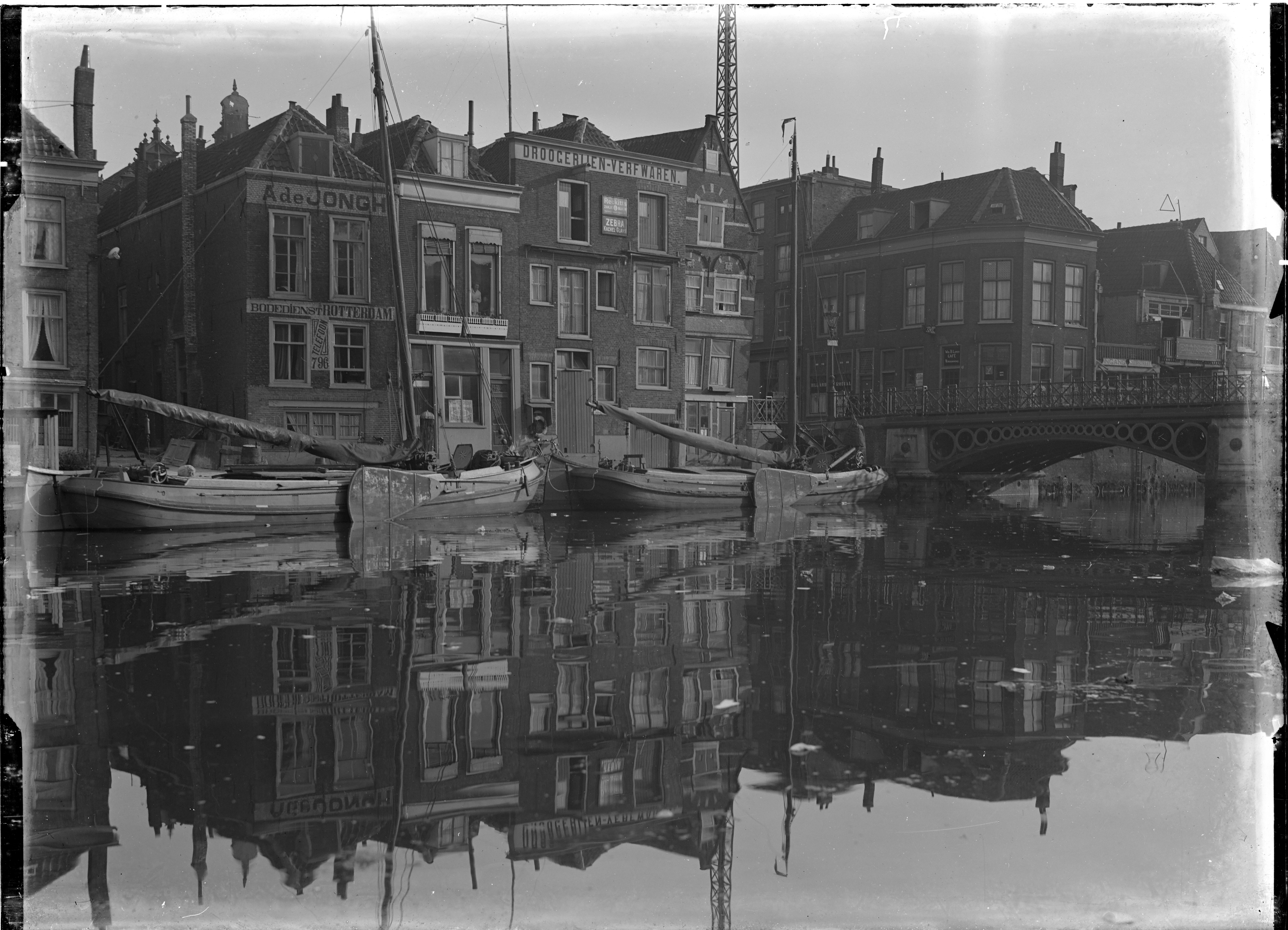 - De Wijnhaven met de achterzijde van panden aan de Voorstraat ter hoogte van de Houtsteiger (links) en de Nieuwbrug.