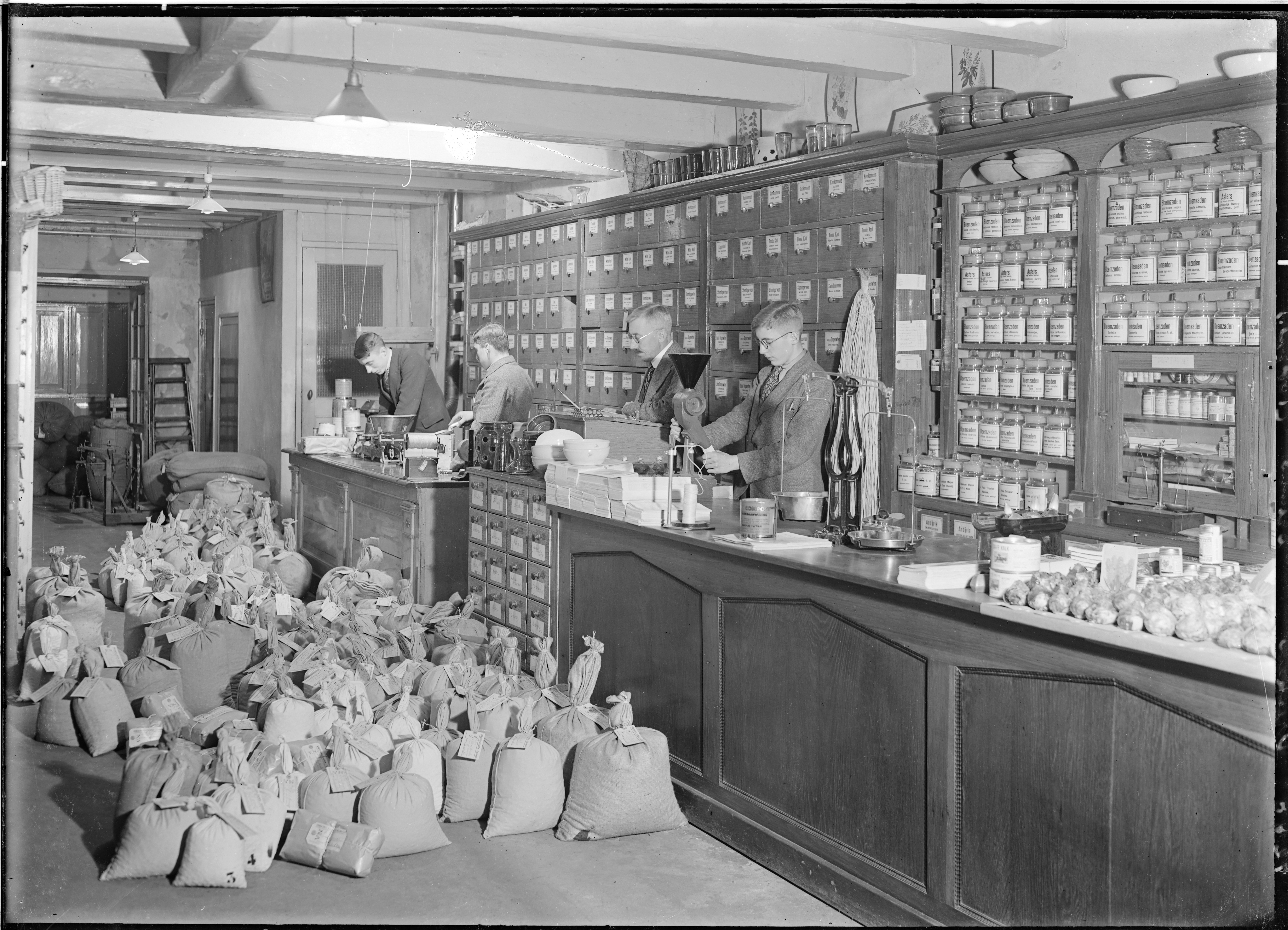 tweede van links is mijn oom Huib Vreeken de oude nummering was Voorstraat 394 de foto is voor de brand van 1938 genomen ik denk ongeveer 1935