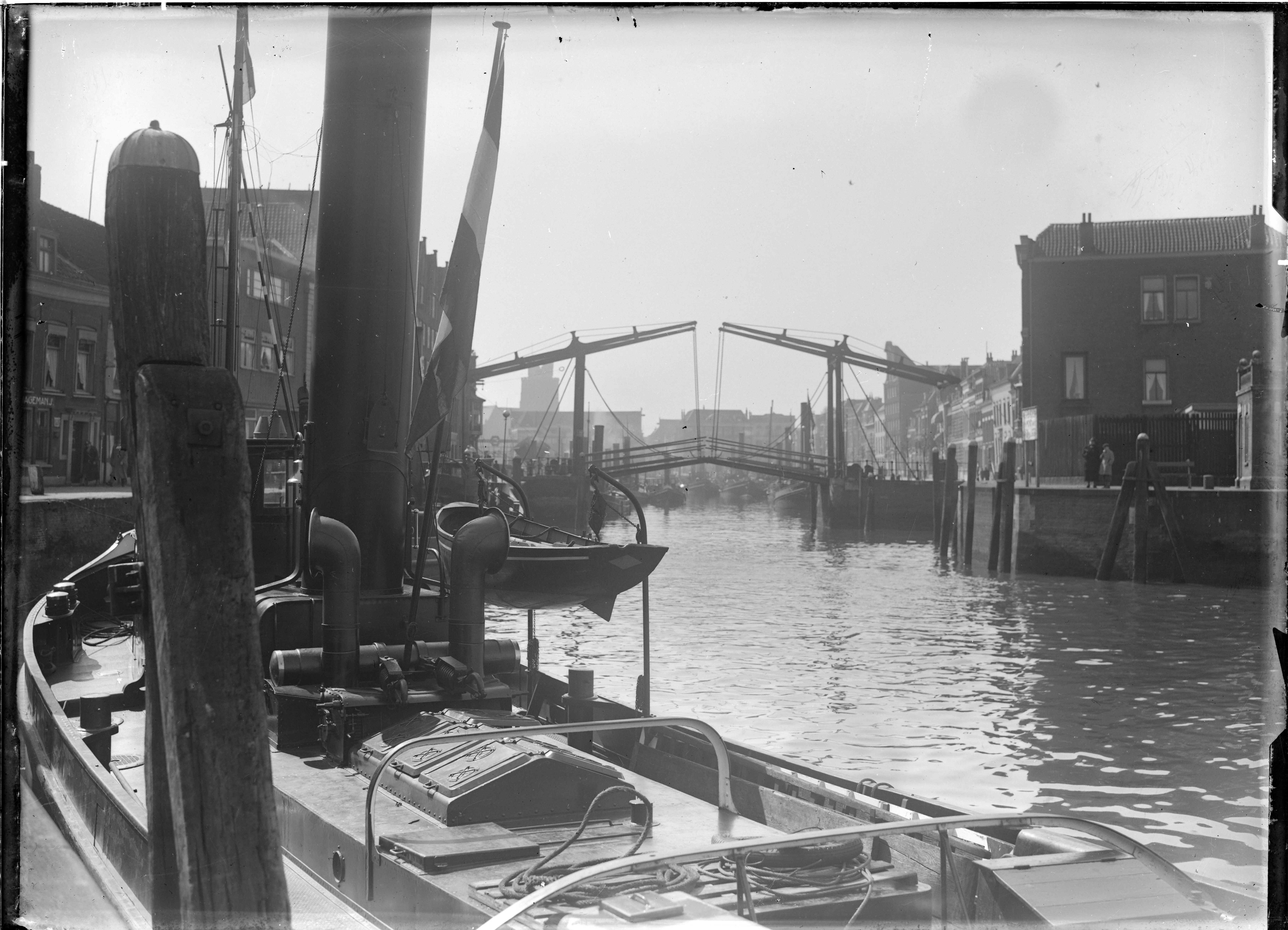 - De Wolwevershaven vanaf het Groothoofd richting Damiatebrug. Links de Kuipershaven, rechts vooraan het Damiatebolwerk, daarachter de Wolwevershaven. Rechts door de brug heen is pakhuis Stokholm zichtbaar.