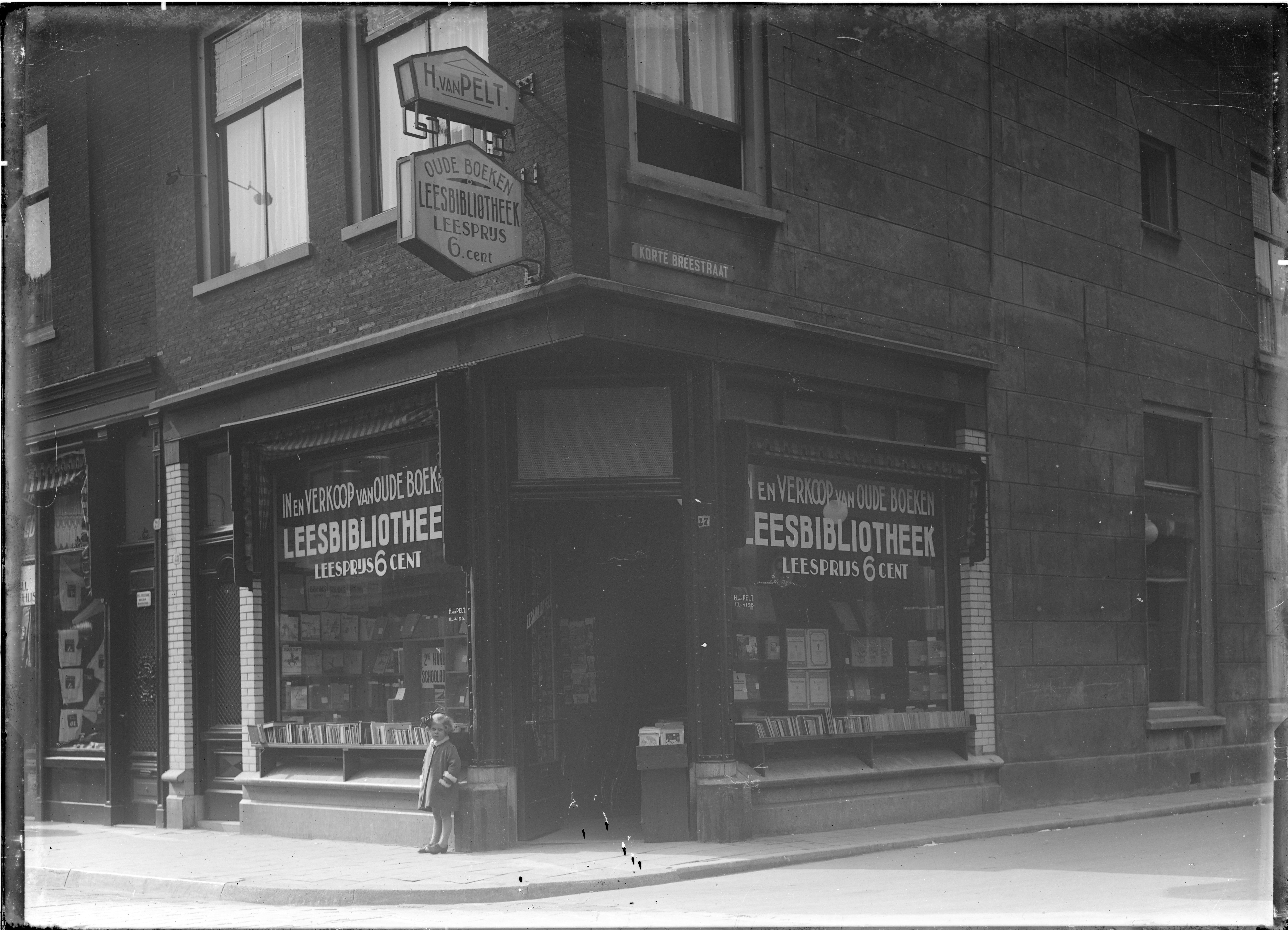 - De leesbibliotheek van H. van Pelt op de hoek Korte Breestraat en de Vriesestraat (links).