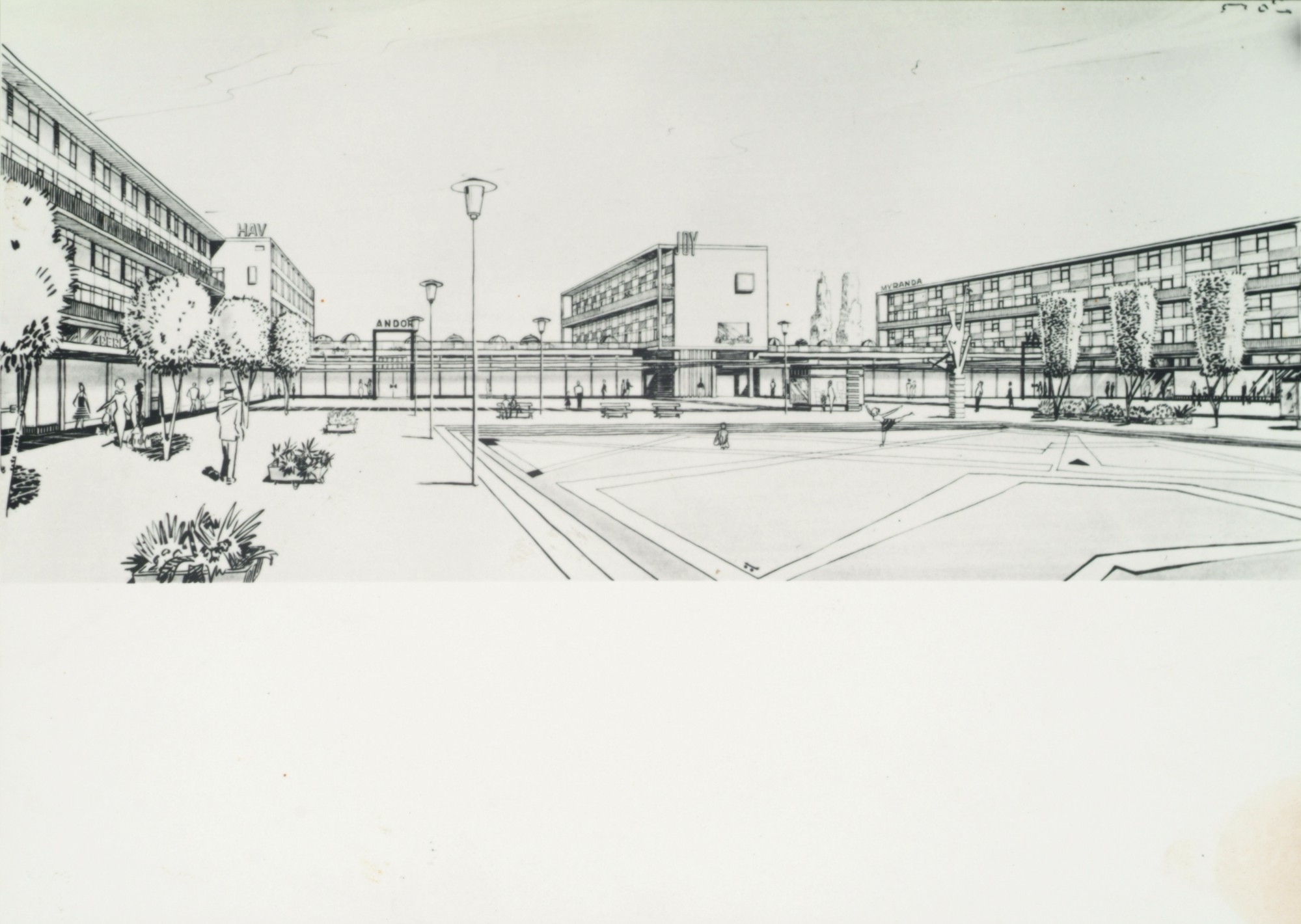 - Tekening bij artikel over winkelcentrum Crabbehof in het Dordrechtsch Nieuwsblad (Stadsnieuws), 22-6-1960.