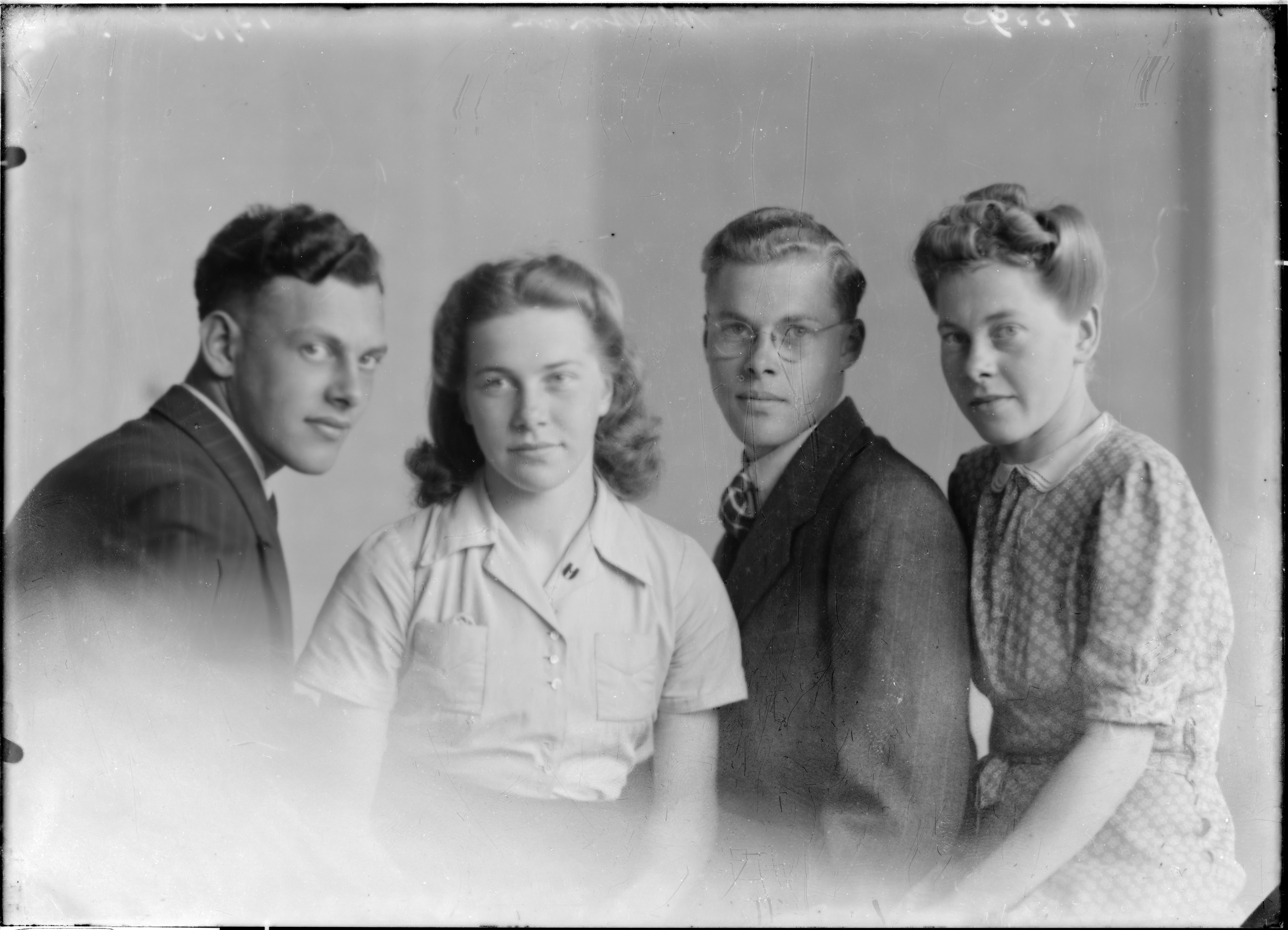 Van Links naar rechts.Adri Waltman, overleden. Cobi Waltman geb 26-10-1926 overleden 4 maart 2015, Jan Waltman, overleden. Loes Waltman geb 9 mei 1916, overleden Zij waren de kinderen van Johannes Waltman geb 16 april 1888 en getrouwd met Antonia Janssen.