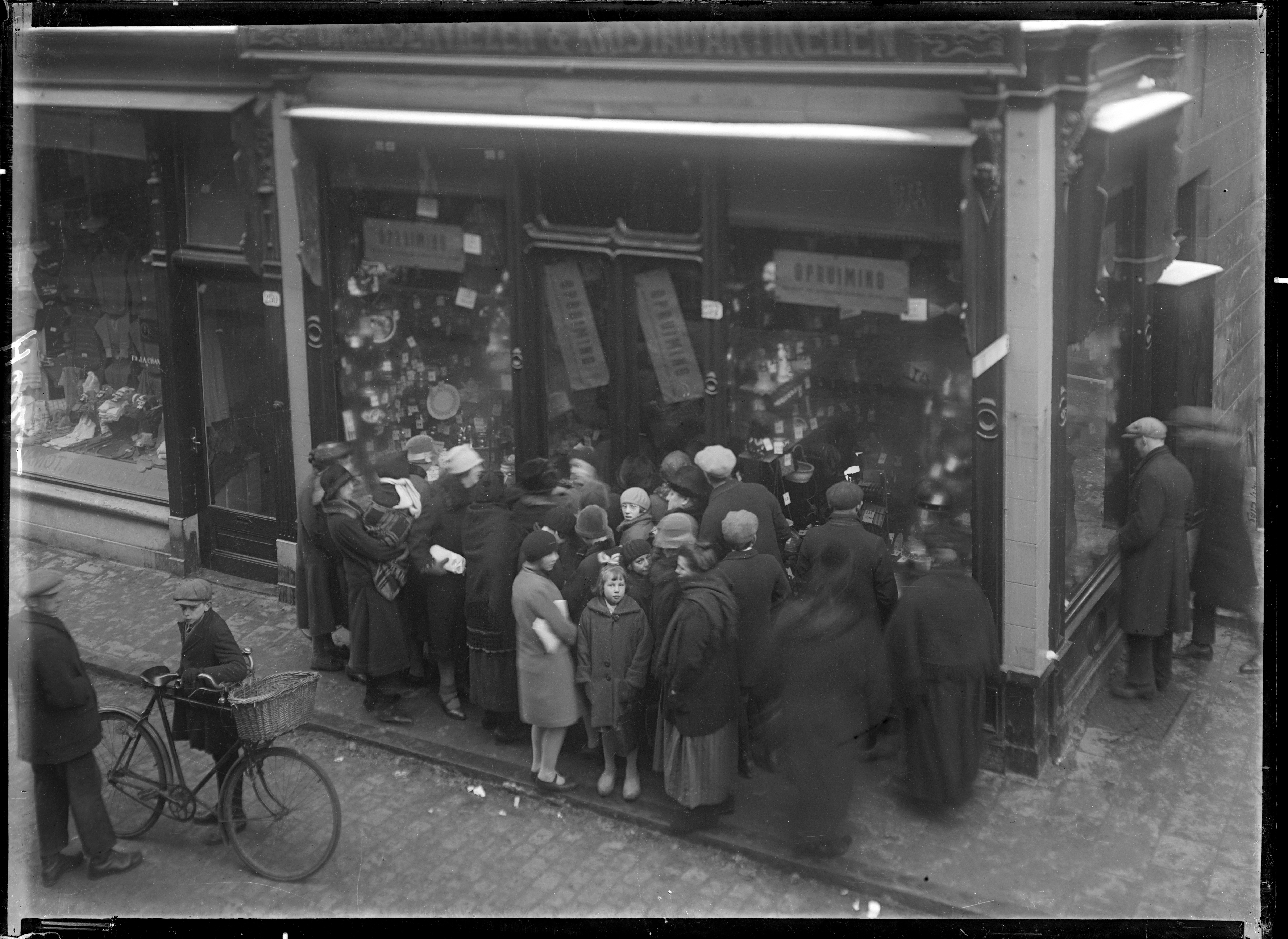 pag. 1815 (Hecker) - Voorstraat 257, mensen voor etalage, opruiming bij P.J. Hecker, 'drankserviezen en kristalartikelen'; (naast Voorstraat 259 fa. J.A. Chamot) --- 1930: P.J. Hecker [galanterieen: handel] Voorstraat 257;