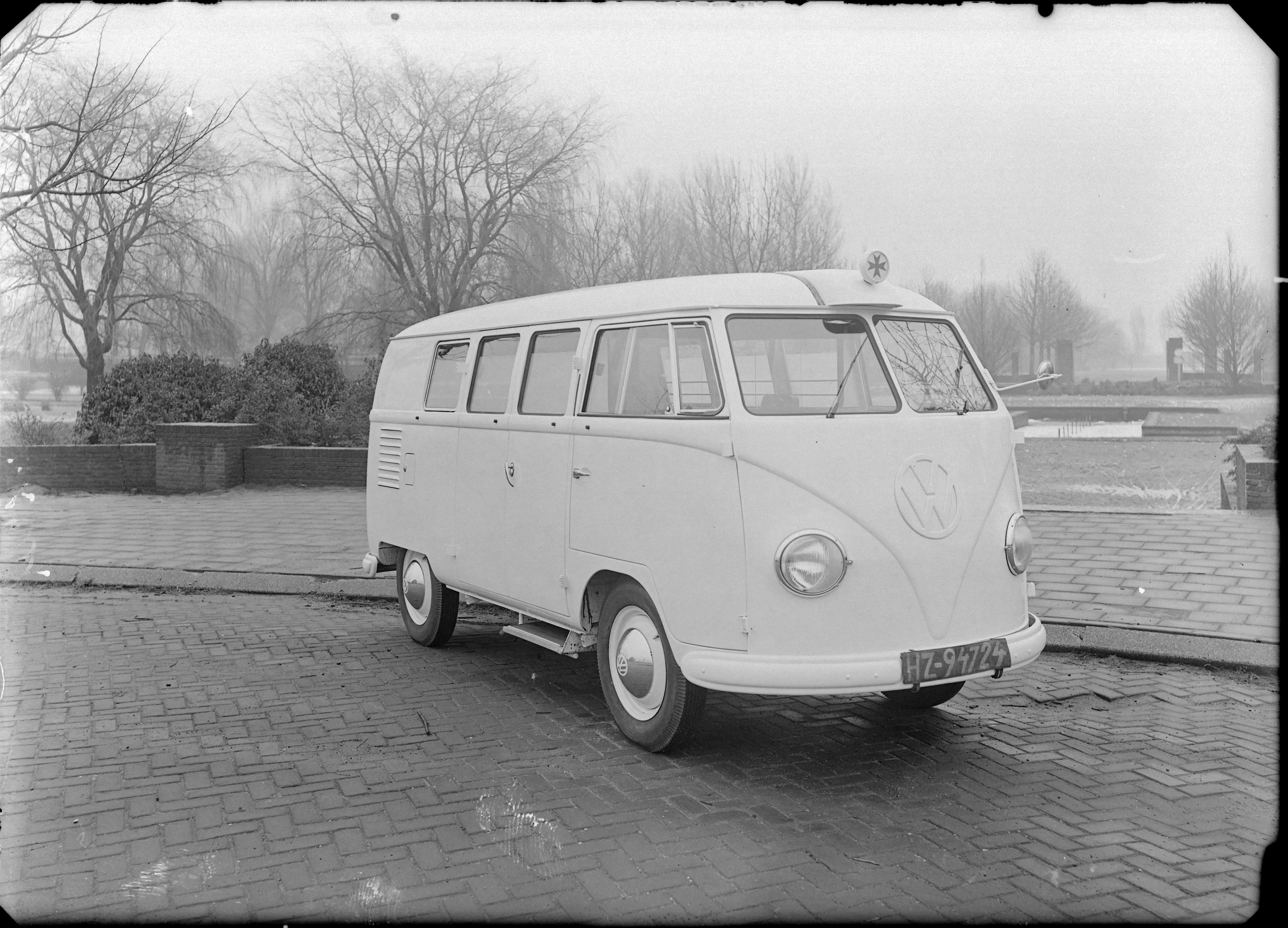 Volkswagenbusje voor ziekenvervoer op/ voor het Wantijplantsoen. Ingang van het Wantijpark op de achtergrond.