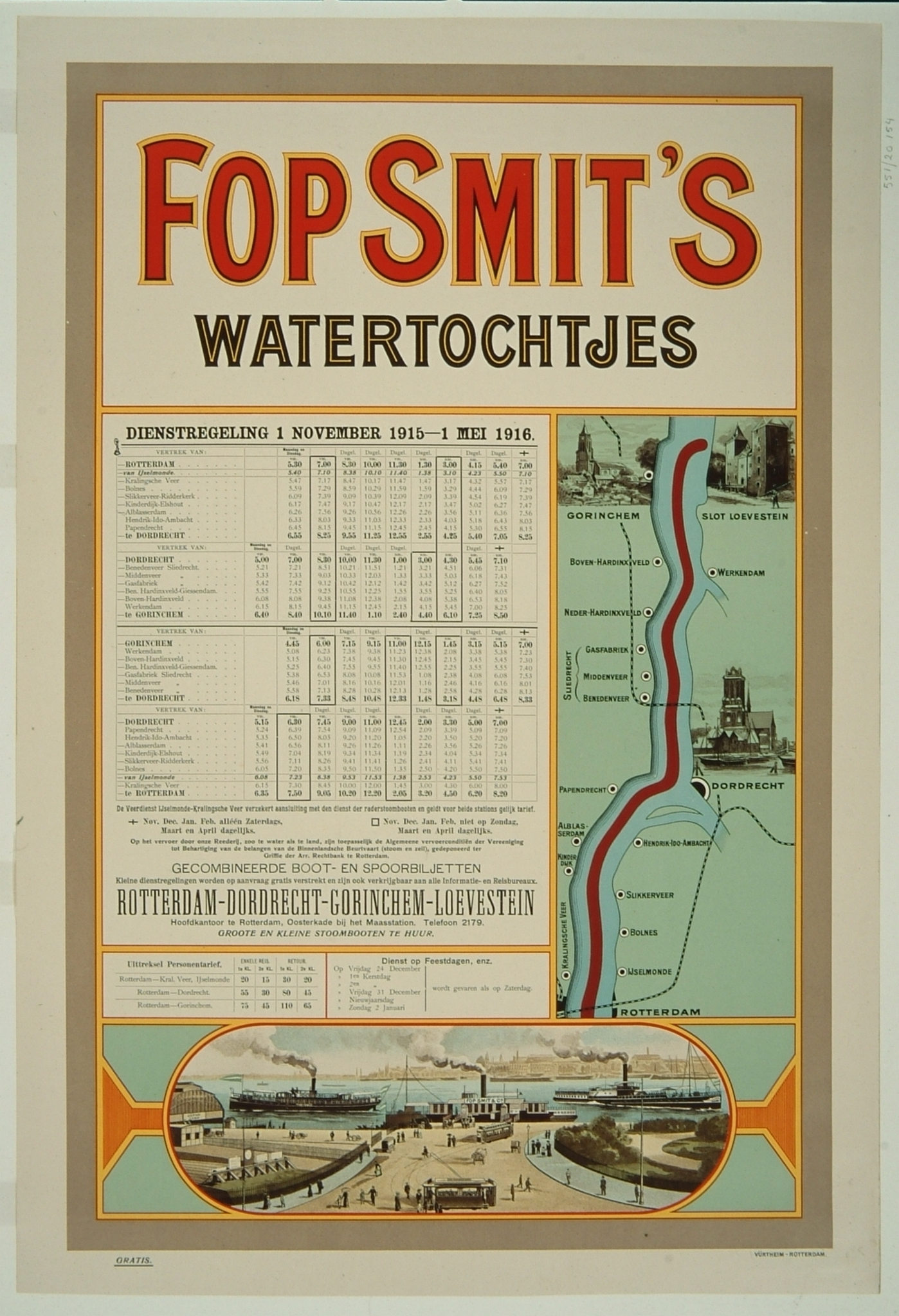 - Dienstregeling november 1915 - april 1916 van de stoombootdienst tussen Rotterdam, Dordrecht, Gorinchem en Loevestein van de firma Fop Smit & co., met gezicht op de afvaartplaats te Rotterdam en een kaartje van de route.