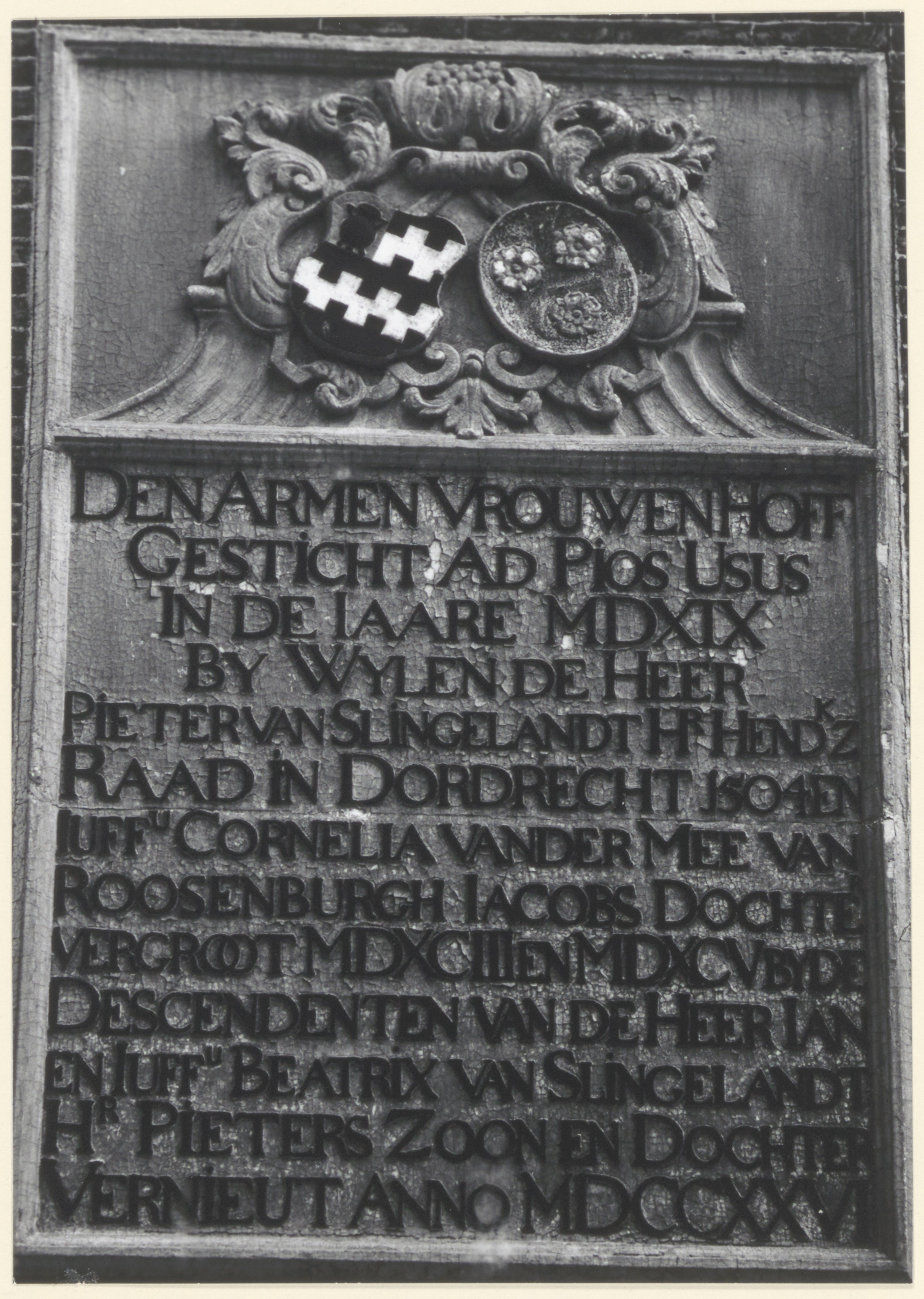 - Gevelsteen aan de voorzijde van het Van Slingelandtshof in de Vriesestraat. Boven de tekst links het wapen van de familie Van Slingelandt en rechts dat van de familie Van der Mee Roosenburgh.