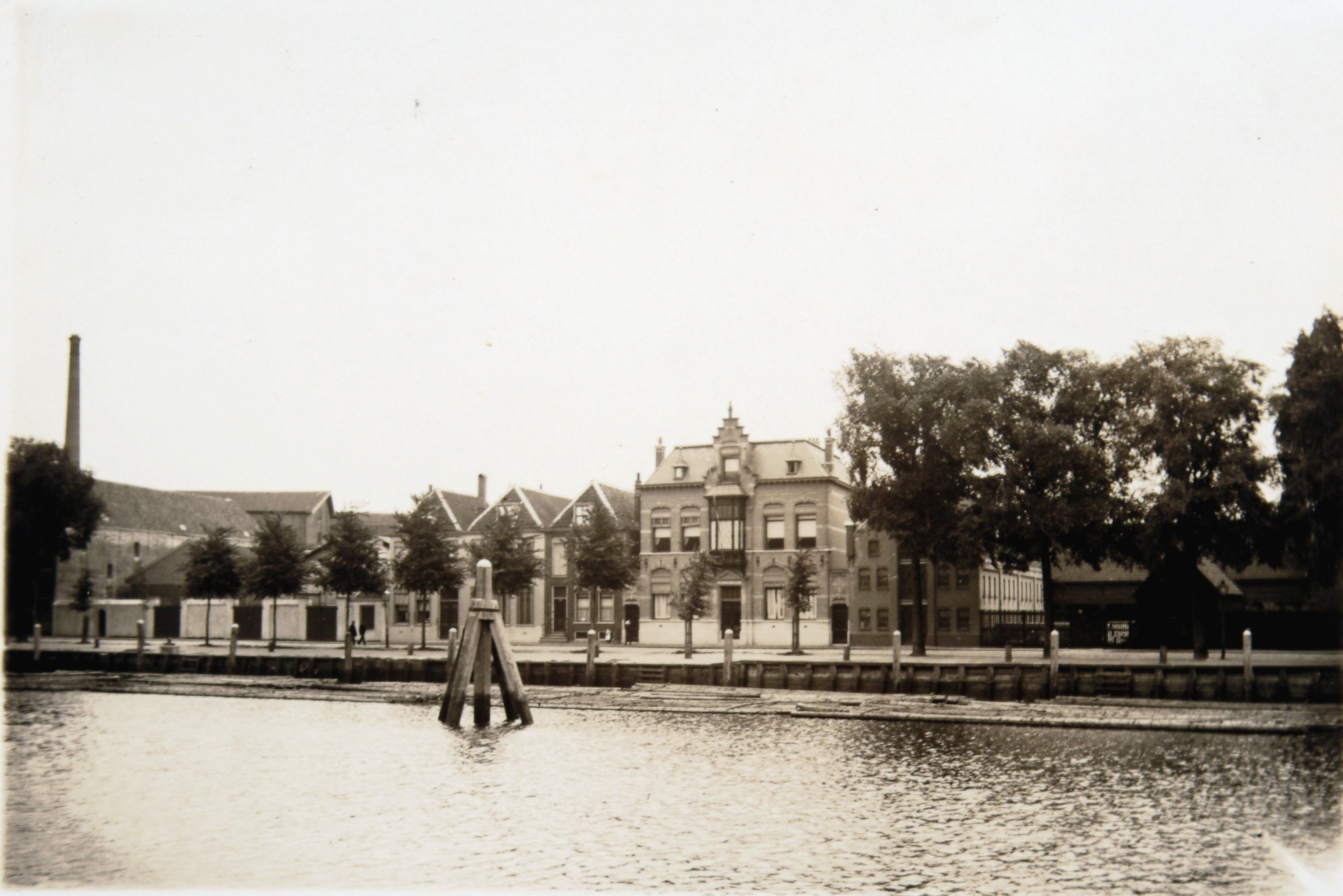 - Gezicht op de Kalkhaven en de bebouwing van het Achterhakkers, zuidzijde. Het huis met het trapgeveltje was van fam. Lebret. De eerste steen werd gelegd in 1898. In het water liggen houtvlotten.