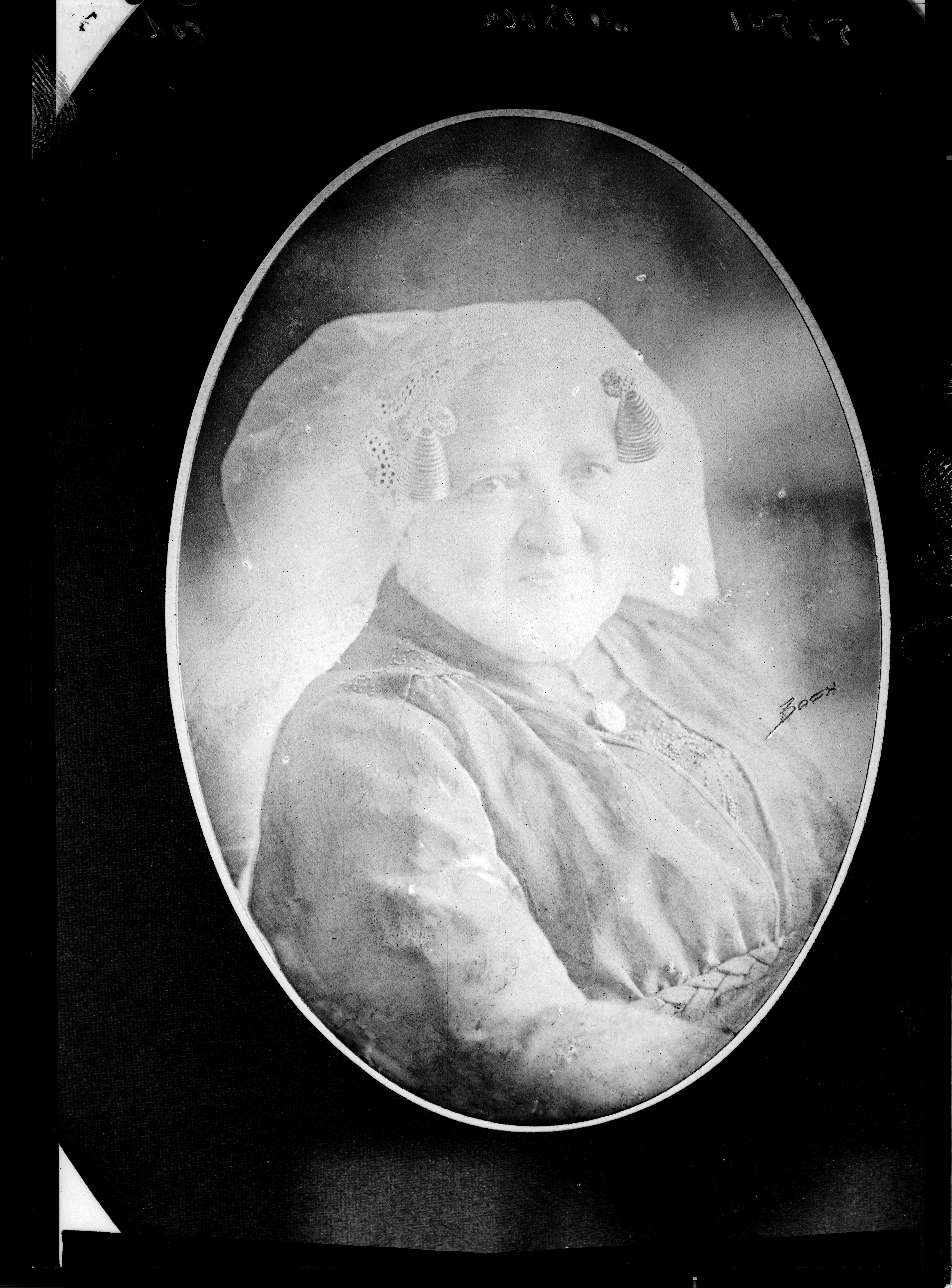 oud ovaal portret, vrouw in Zuidhollandse klederdracht (keuvel / krullenmuts) -- hoort bij 309_116525 (in de rand '52501 DE BOER');