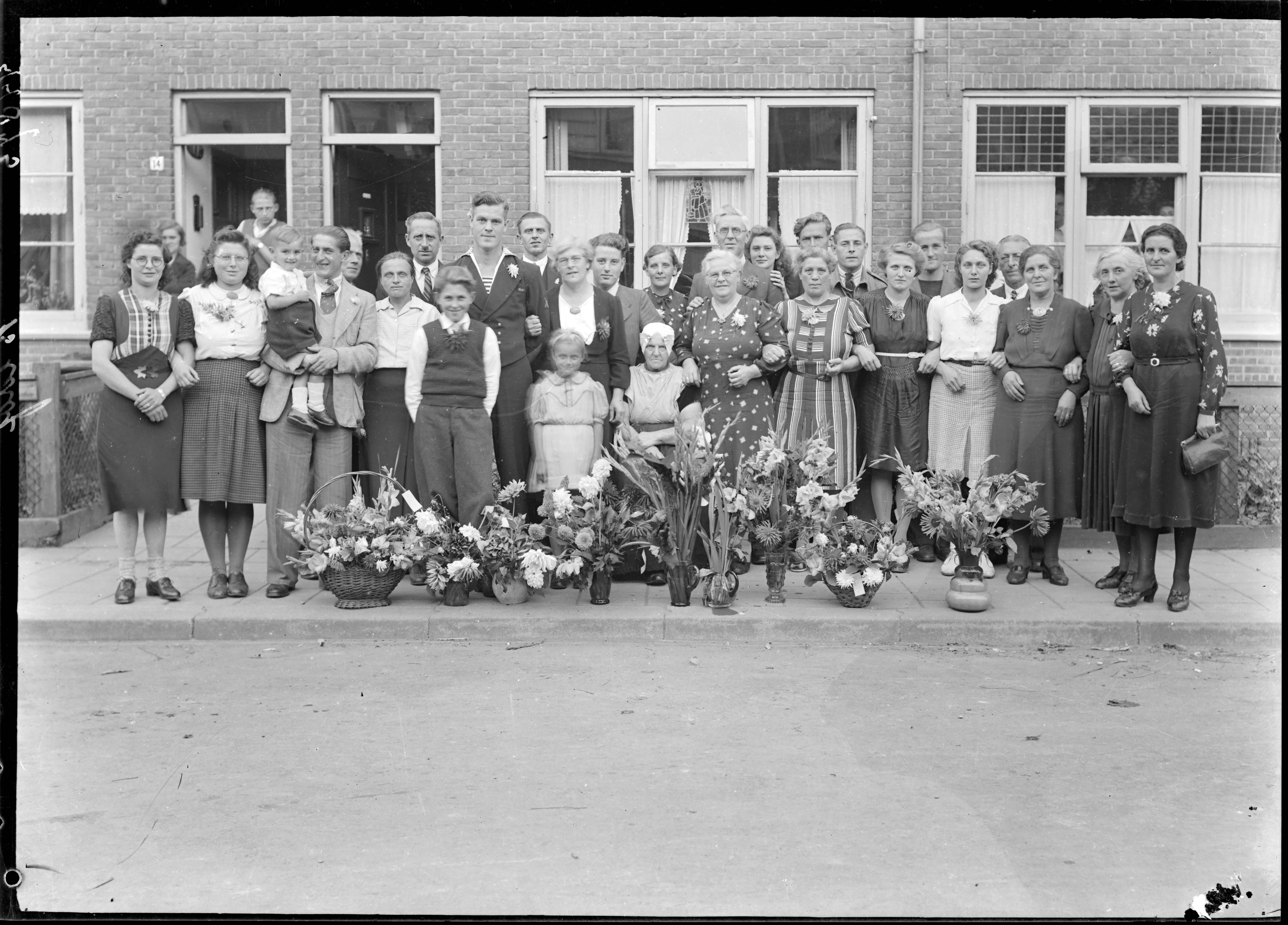 Datum is 13 september 1945 (archief Beerman). Ik vermoed dat de zittende dame met Zeeuwse kap Maria Theresia van Woensel is, geboren te ‘s-Heerenhoek, 8 mei 1866, overleden te Kruiningen 5 juni 1958. Zij is namelijk de moeder van Maria Francina Dommanschet, die in 1947 als weduwe van Cornelis van Bedaf werd geregistreerd op Loggerstraat 16. Hoewel zij wel centraal in het midden zit, zie ik geen relatie tussen de datum en mevrouw Van Woensel.