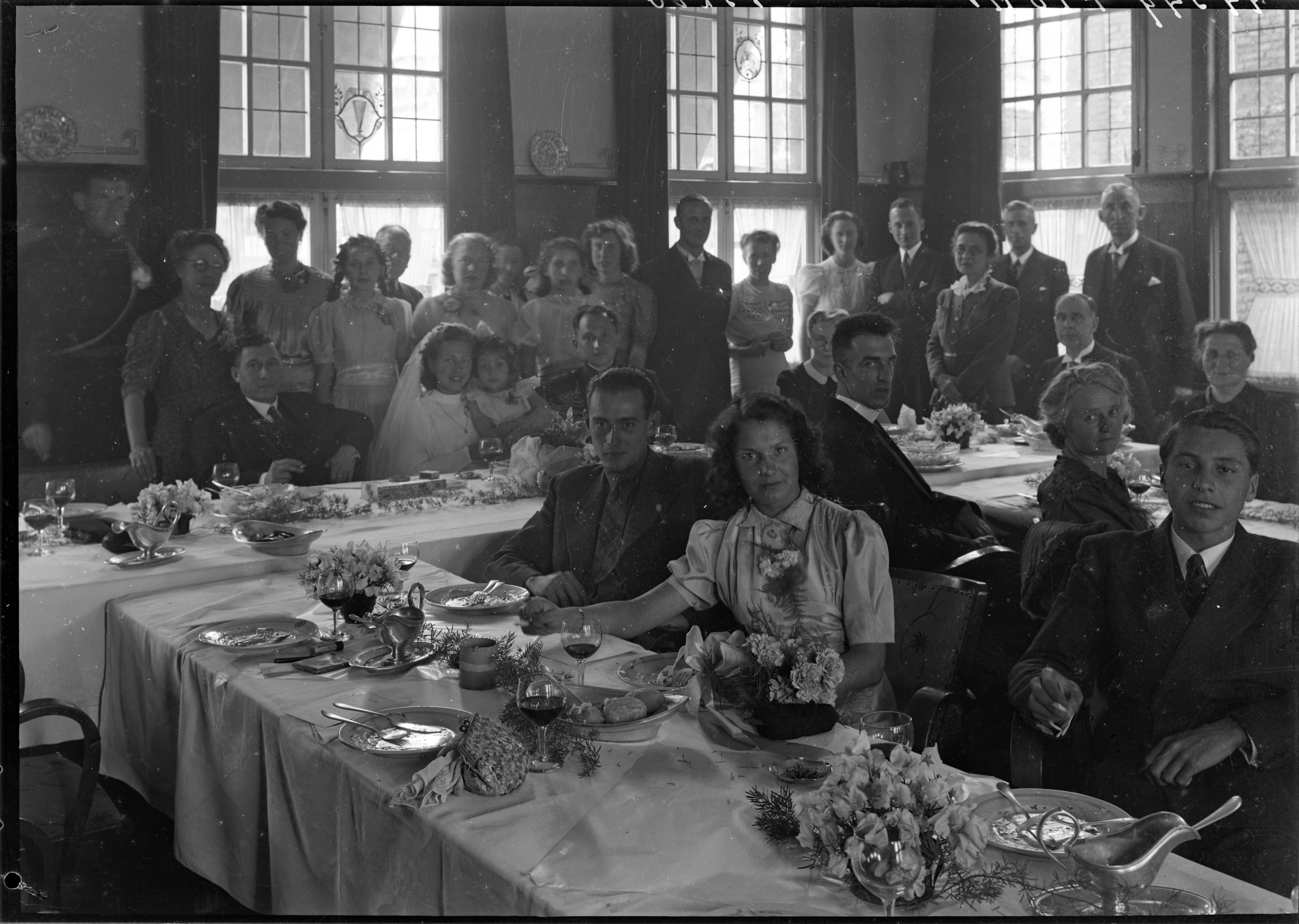 Huwelijk 27 juli 1945. Hans Adolf Flohr (Vrieseweg 52 oud nr, 90 nieuw nr), kapitein in de KNIL, vandaar dat zijn epauletten zichtbaar zijn. Getrouwd met Lizij van Dam (1922).