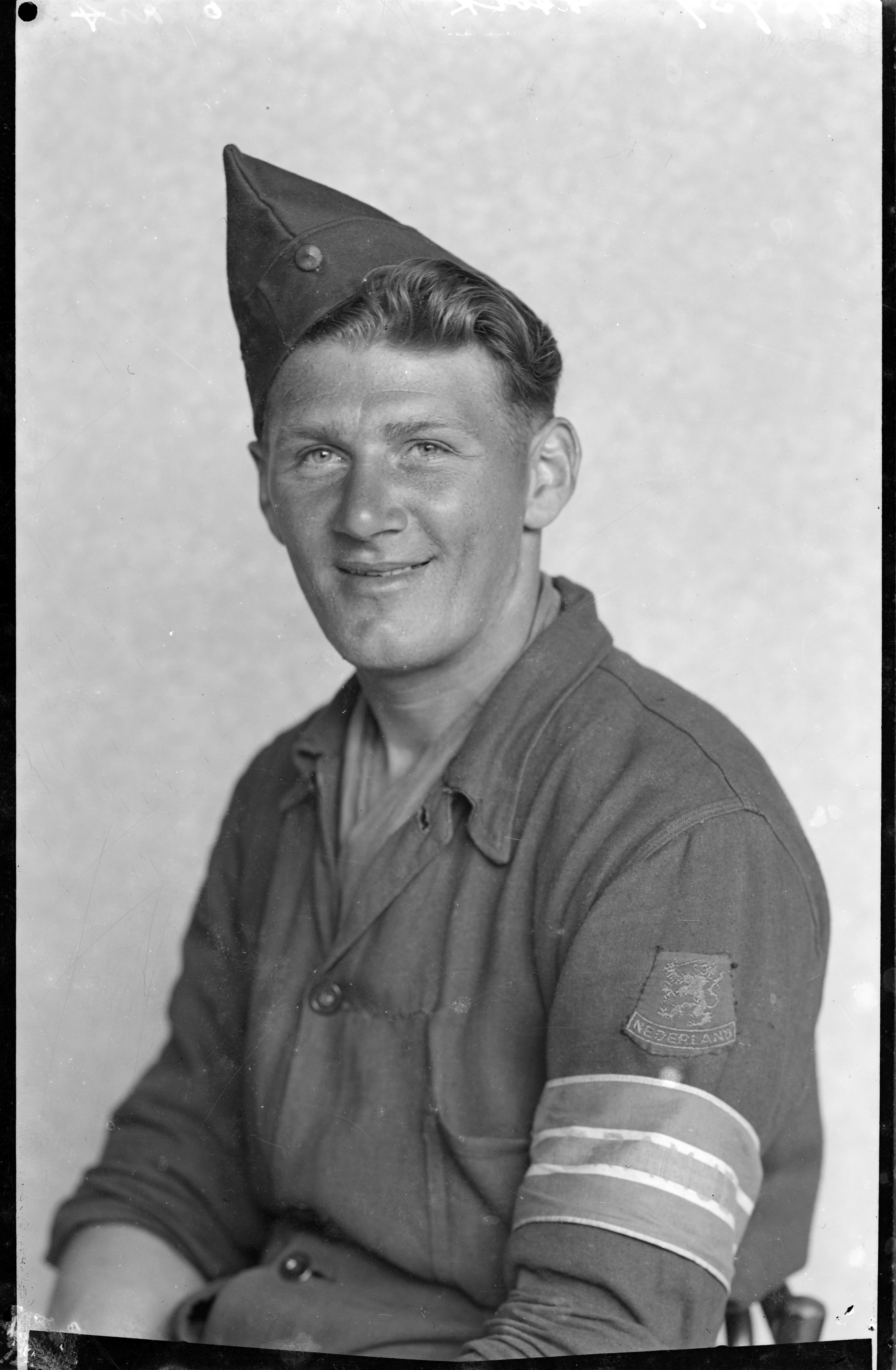 man in uniform (band, armband Oranje, pet) ---- juli 1945 fotonummer 43934 Stolk, Ringdijk B233, Ridderkerk [bron: www.dordtenaZOEKer.nl]