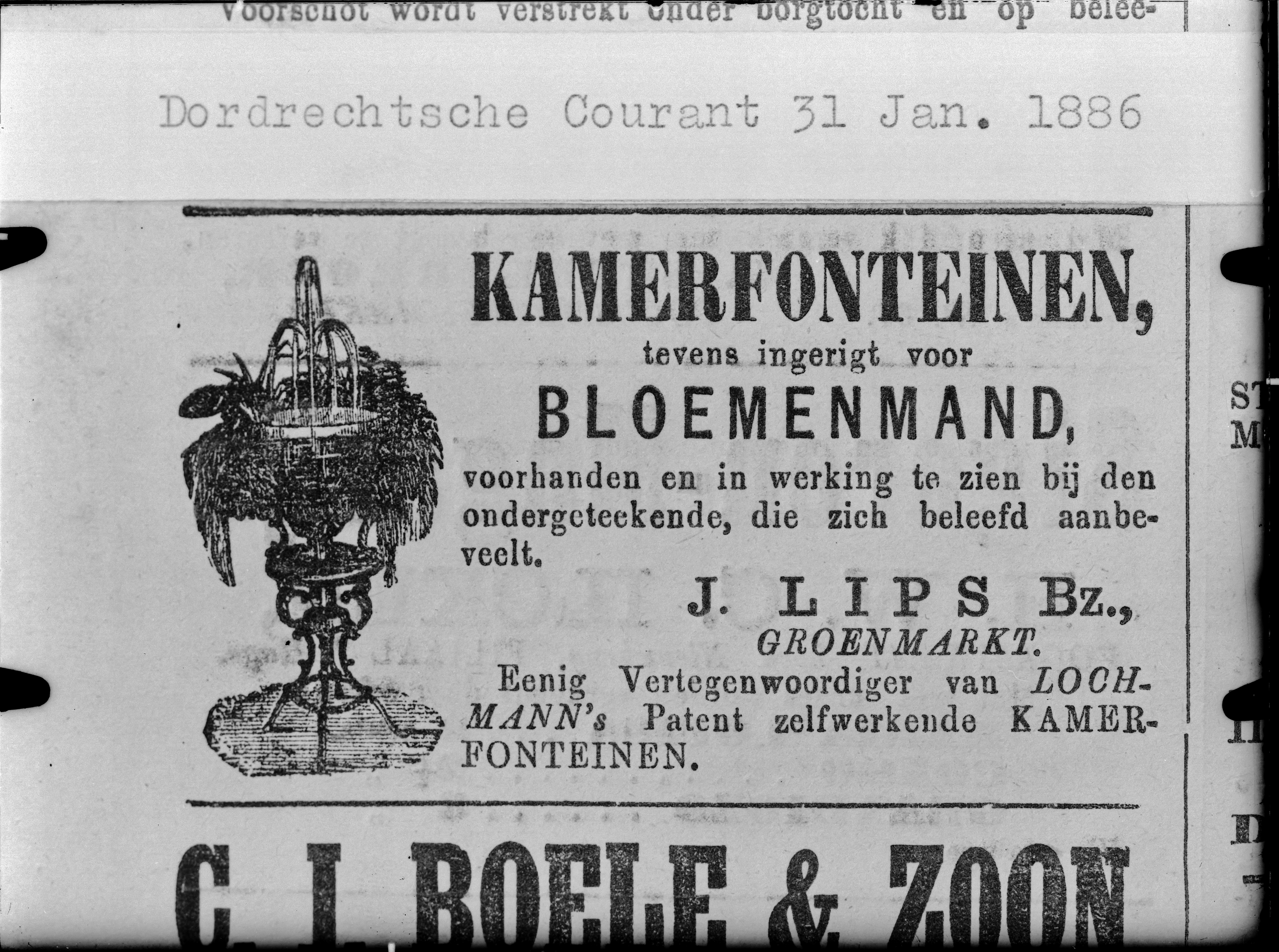 (RECLAME) Dordrechtsche Courant 31-1-1886--- J. LIPS Bz, Groenmarkt, kamerfonteinen, bloemenmand