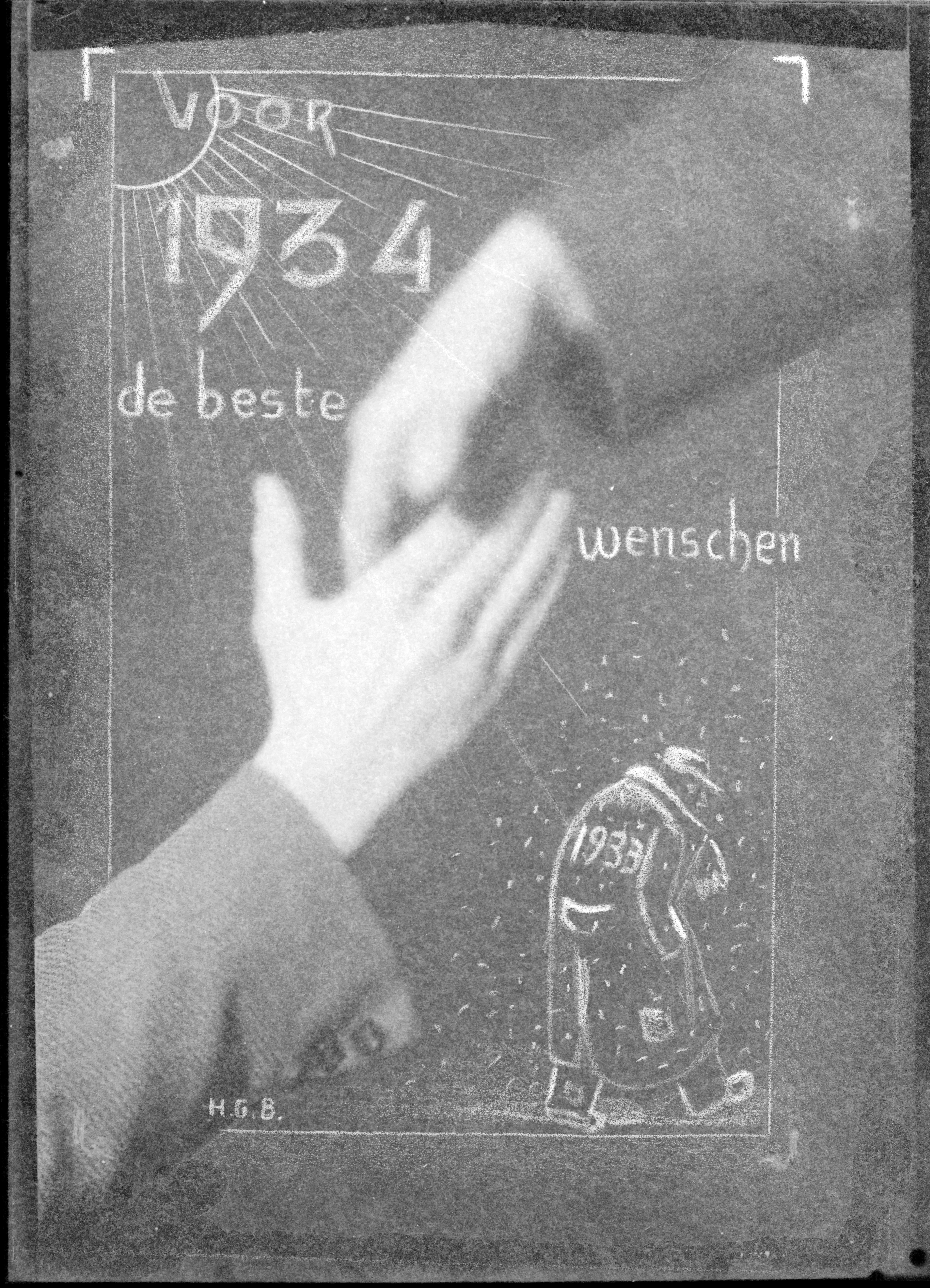 (nieuwjaarskaart familie H.G. Beerman) 1933 loopt weg; voor 1934 de beste wenschen; schuddende handen (H.G.B.)