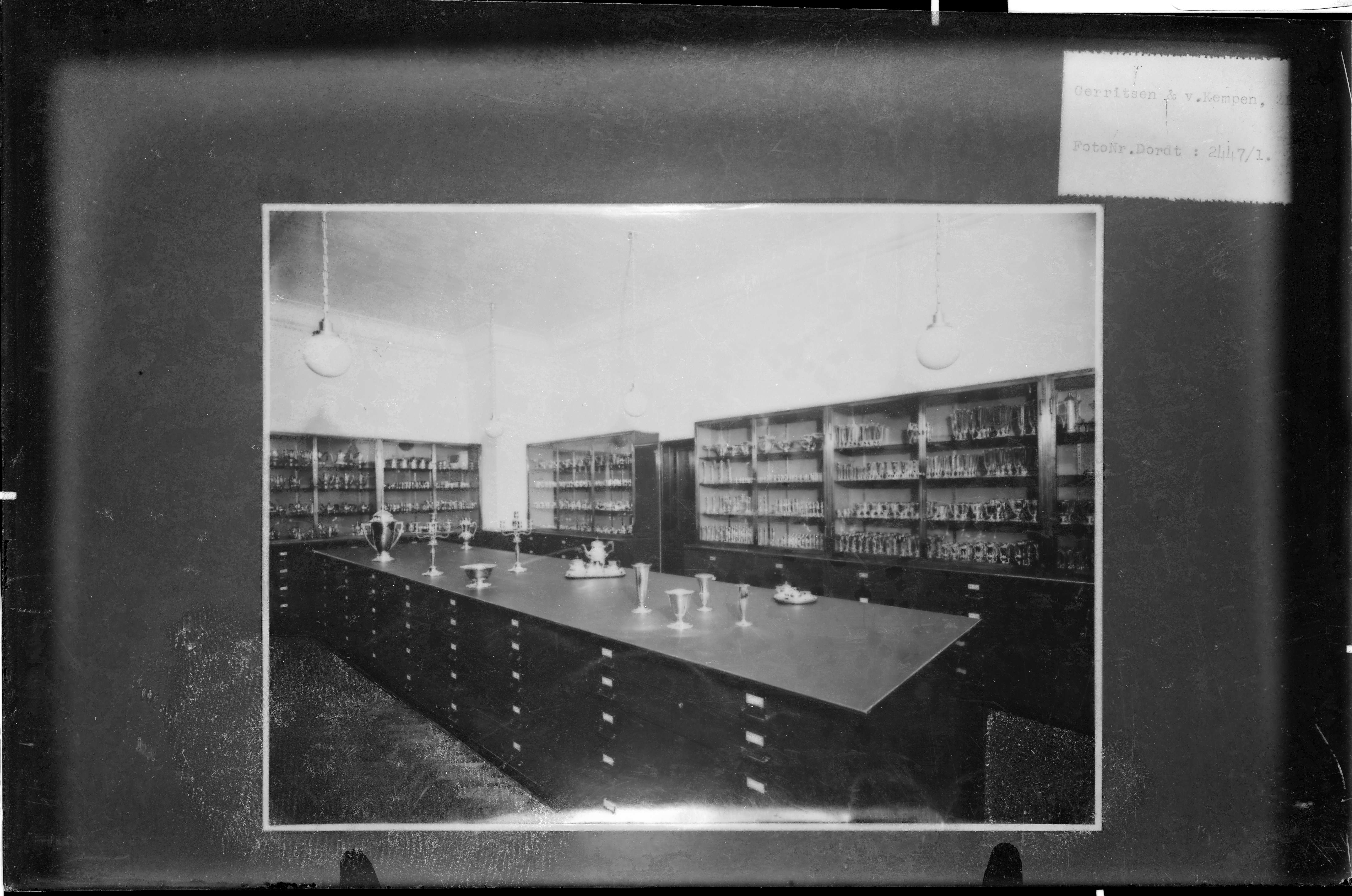 (Gerritsen & van Kempen, foto nr. Dordt 2447/1) (zilveren ?) bekers in vitrinekasten