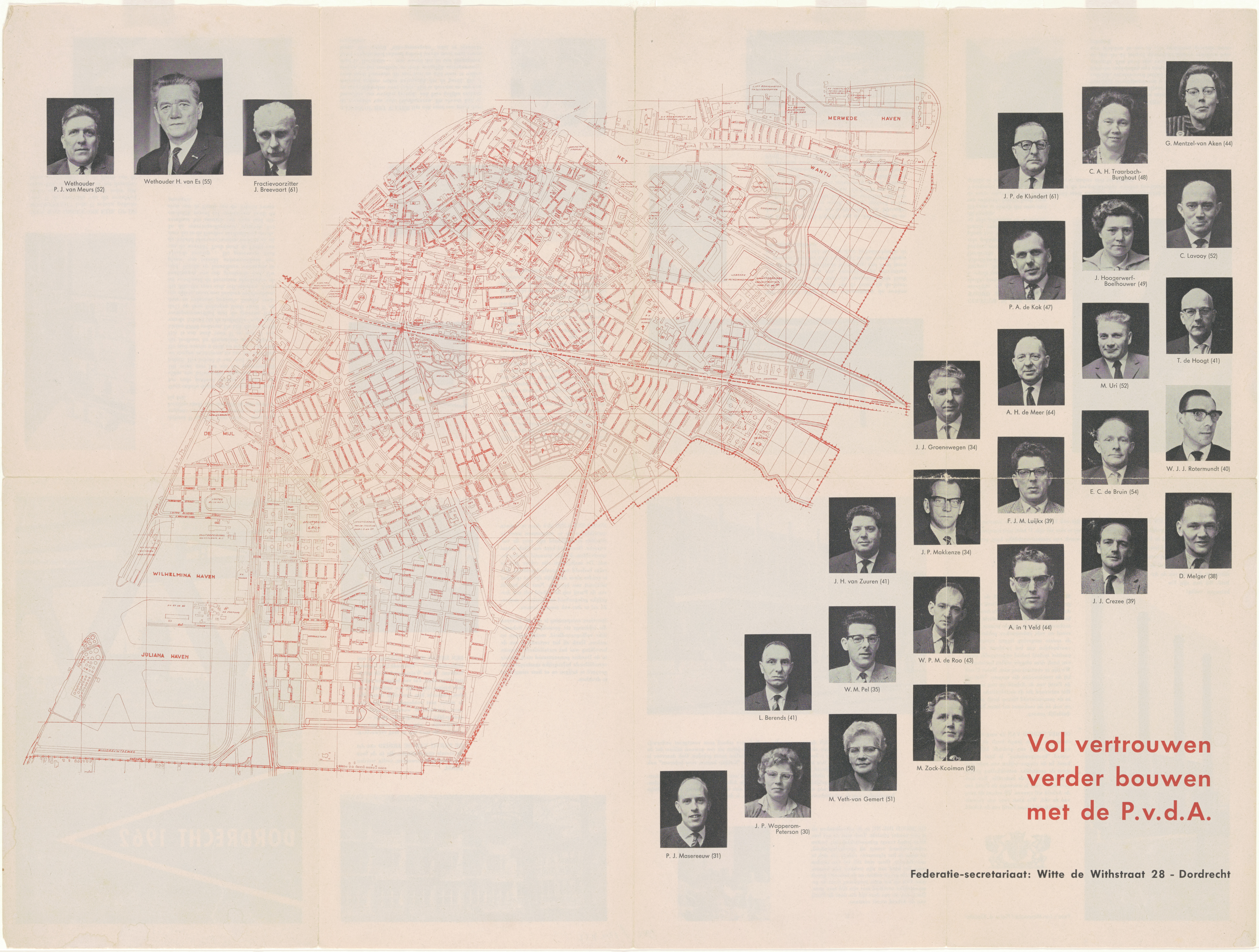foto's leden P.v.d.A. - wethouder P.J. van Meurs (52), wethouder H. van Es (55), J. Breevaart (61), J.P. de Klundert (61), C.A.H. Traarbach-Burghout (48), G. Mentzel-van Aken (44), P.A. de Kok (47), C. Lavooy (52), J. Hoogerwerf-Boelhouwer (49), T. de Hoogt, M. uri, A.H. de Meer, J.J. Groenewegen, W.J.J. Rotermundt (40), E.C. de Bruin, F.J.M. Luijkx, J.. Makkenze (34), J.H. van Zuuren (41), D. Melger, J.J. Crezee (39), A. in 't Veld (44), W.P.M. de Roo (43), W.M. Pel, L. Berends, M. Zock-Kooiman, M. Veth-van Gemert, J.P. Wapperom-Peterson (30), P.J. Masereeuw (3); (Witte de Withstraat 28 Dordrecht) -- plattegrond Dordrecht