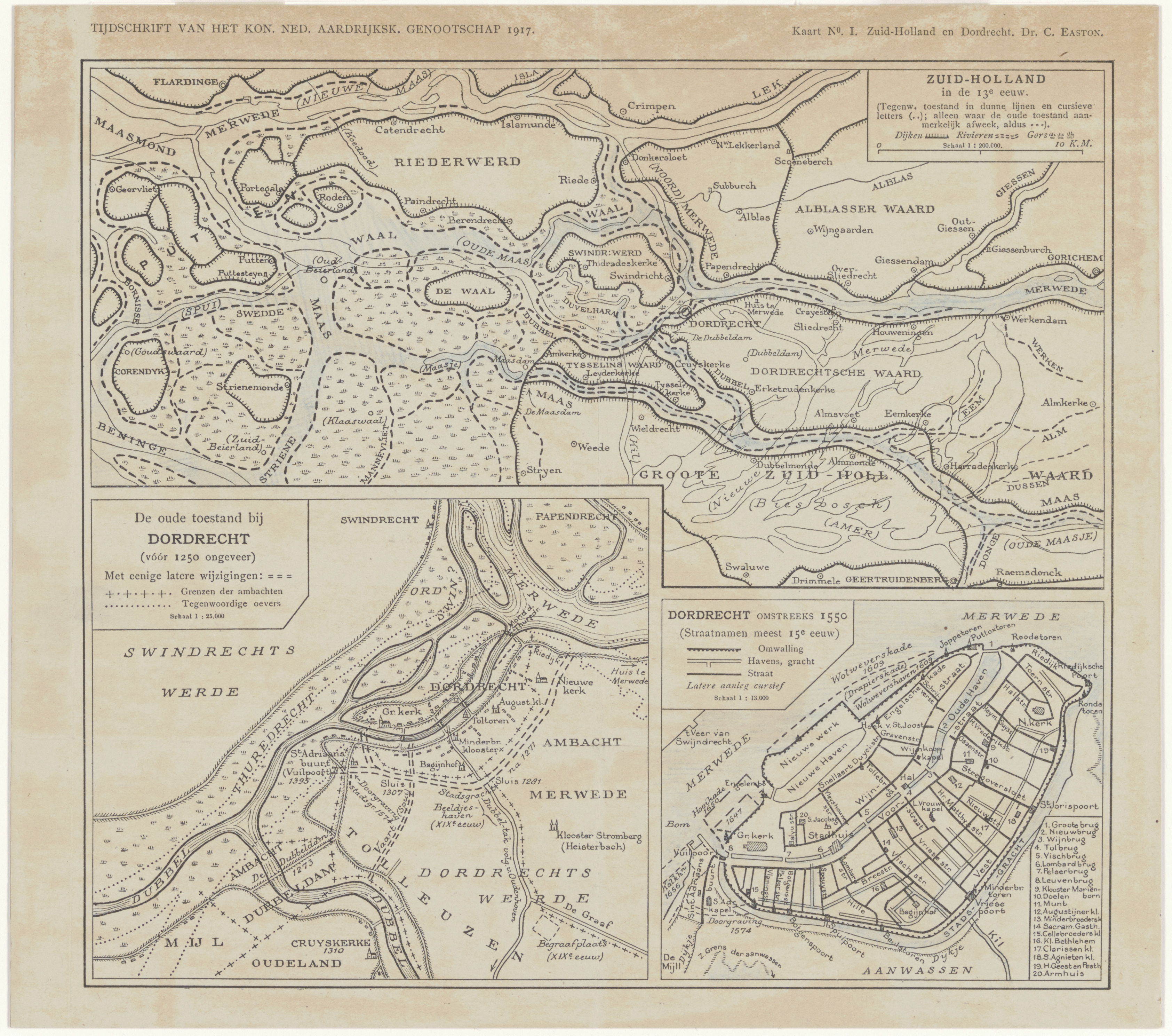 kaart Dordrecht voor 1250 / Zuid-Holland 13e eeuw, Dordrecht omstreeks 1550 (uit: Tijdschrift van het Kon. Ned. Aardrijkskundig Genootschap 1917, dr. C. Easton)