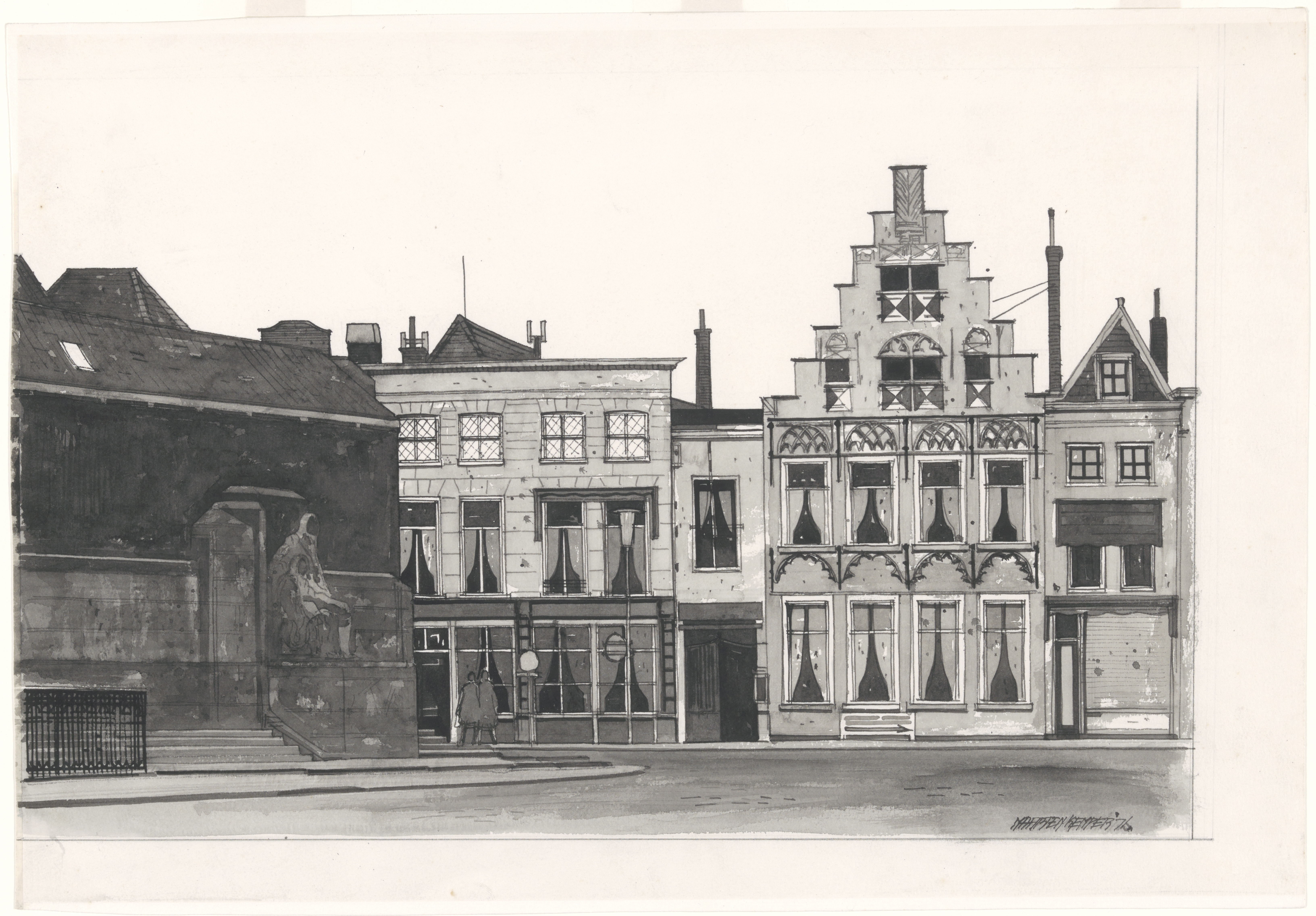 - Tekening door Maarten Kemper van het standbeeld van de gebroeders De Witt op de Visbrug en van gebouw Americain aan de Groenmarkt.