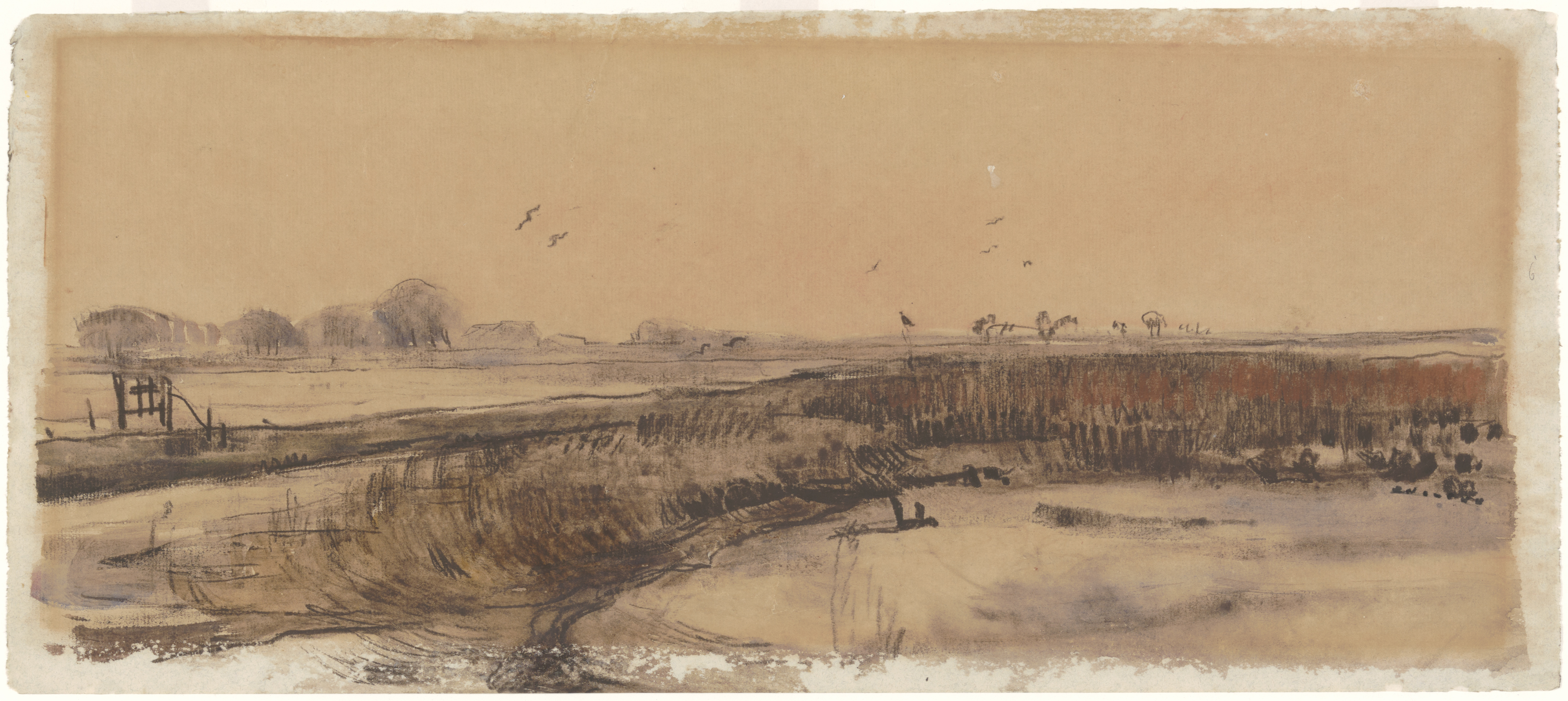 tekening (landschap met vogels, hek)
